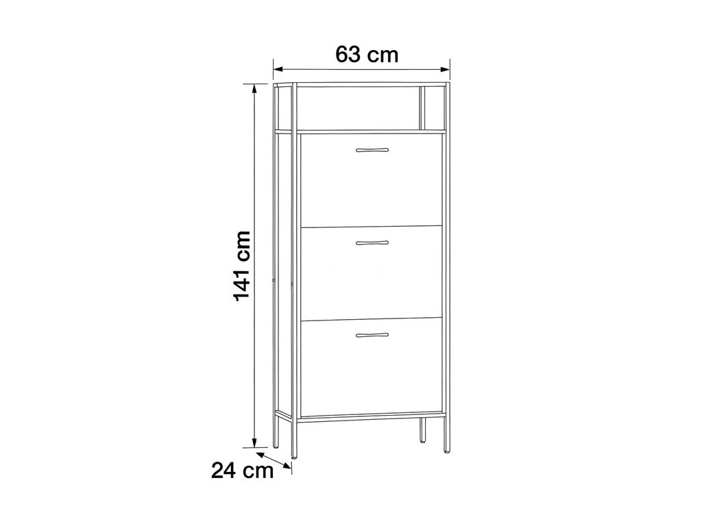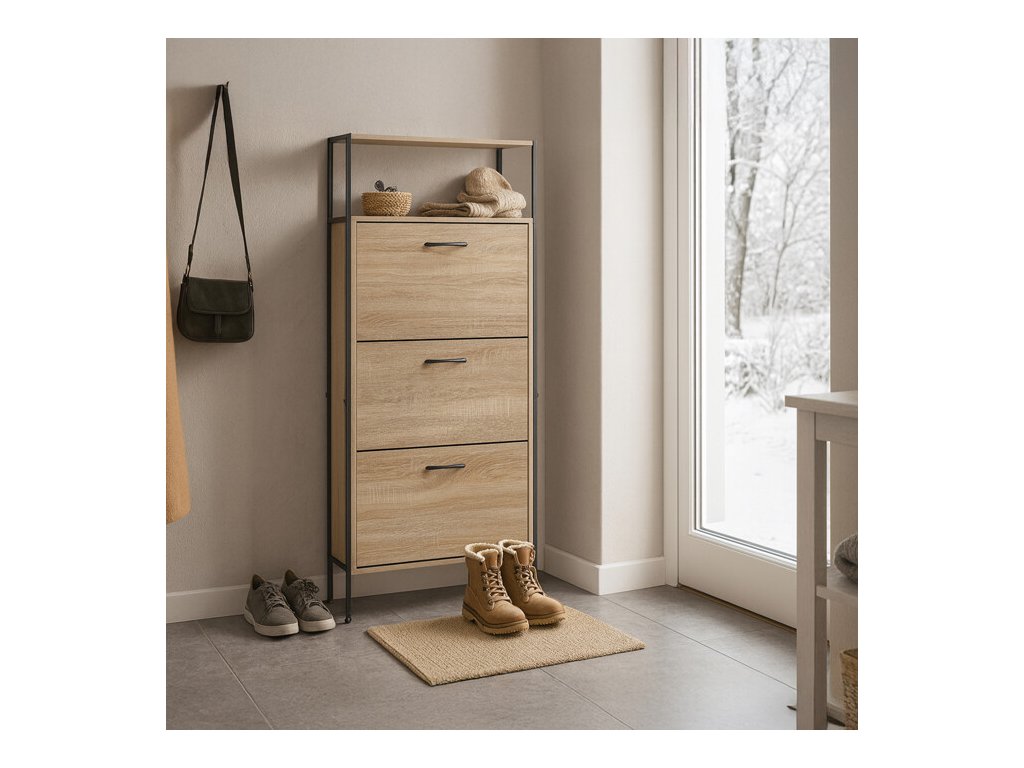 Tento moderný botník spája funkčnosť a jednoduchý dizajn, vďaka čomu sa hodí do menších aj väčších predsiení či chodieb. Vyrobený je z kvalitných MDF dosiek v dekore dreva, ktorý pôsobí prirodzene a zároveň sa ľahko udržiava. Kovová konštrukcia zaisťuje stabilitu, pevnosť a odľahčuje celkový vzhľad nábytku.Botník ponúka tri priestranné výklopné priehradky na uloženie obuvi a praktickú hornú policu, ktorá môže slúžiť na dekorácie alebo drobné predmety. Čierne úzke úchytky umožňujú pohodlné otváranie a dopĺňajú moderný štýl tohto kusu nábytku. Vďaka kompaktným rozmerom sa perfektne hodí aj do menších priestorov, kde šetrí miesto a zároveň pomáha udržiavať poriadok.