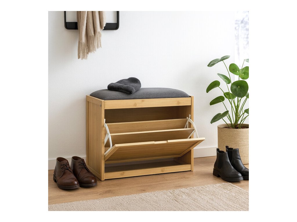 Dodajte svojej predsieni dotyk prírody a praktickú funkčnosť s týmto elegantným bambusovým botníkom. Spojenie masívneho bambusu, pohodlného polstrovaného sedáku v sivej farbe a skrytého úložného priestoru robí z tohto kúska ideálny doplnok do každej modernej domácnosti.Tento botník v škandinávskom štýle nielenže poskytuje komfortné sedenie pri obúvaní, ale vďaka priestrannému úložnému priestoru vám pomôže udržať poriadok vo vašej obuvi. Robustná bambusová konštrukcia zaručuje stabilitu a dlhú životnosť, zatiaľ čo jemný sivý poťah sedadla pridáva nádych elegancie.