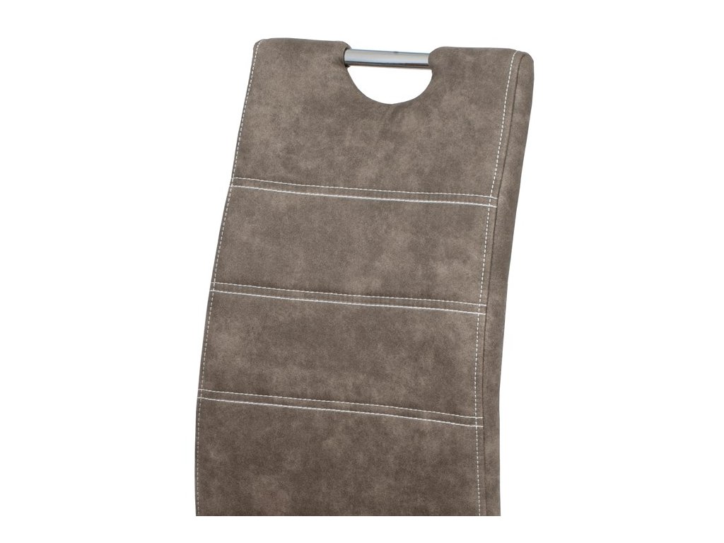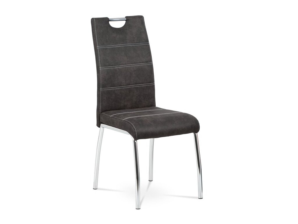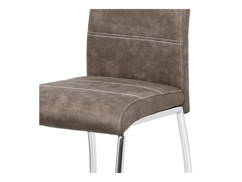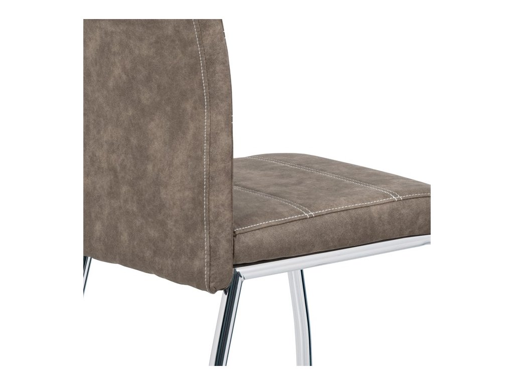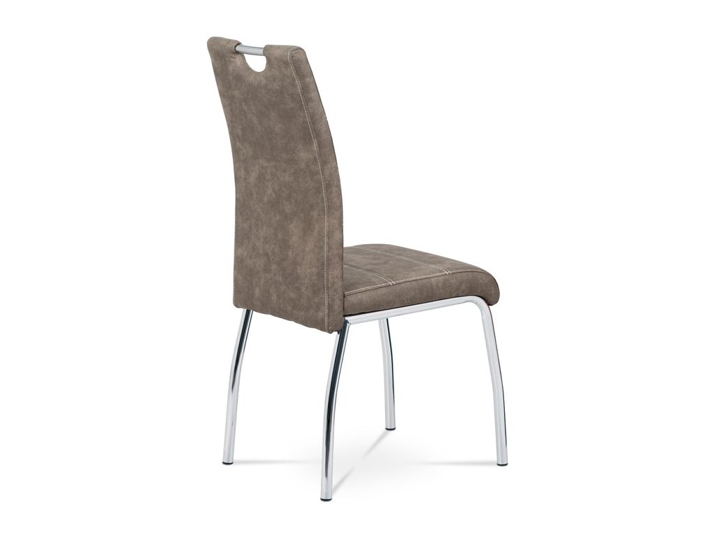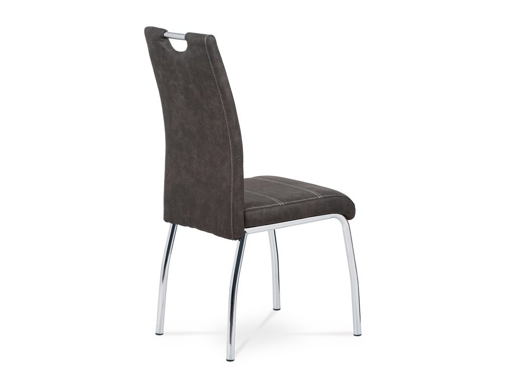 Jedálenská stolička v modernom štýle. Poťah je z elegantnej hnedej látky v dekore vintage brúsenej kože, veľmi príjemnej na dotyk a veľmi ústretovej na bezproblémovú údržbu, s bielym horizontálnym a obvodovým prešitím operadla aj sedadla. Potrebnú stabilitu a pevnosť dodáva mohutná kovová štvornohá podnož s chrómovou úpravou. Nohy sú kruhového prierezu, opatrené plastovými klzákmi, ktoré znížia riziko poškodenia vašej podlahy na minimum. Pre ľahšiu manipuláciu má stolička kovové madlo v hornej časti operadla, čo predstavuje veľmi praktický funkčný doplnok. Stolička svojim mohutným, moderným a praktickým prevedením predstavuje ideálnu voľbu do akéhokoľvek jedálenského kútika, kuchyne či spoločenskej miestnosti.Dodatočné parametre