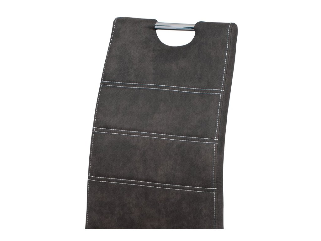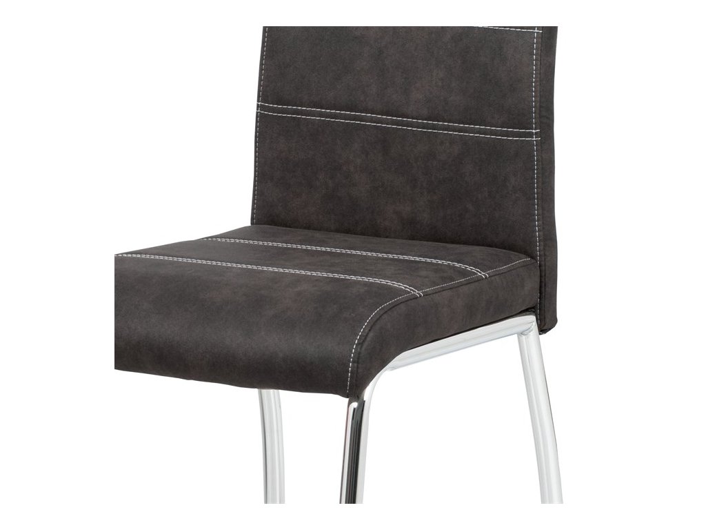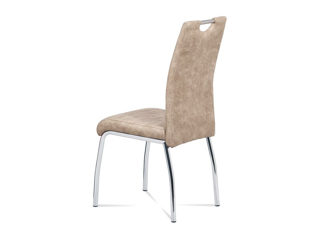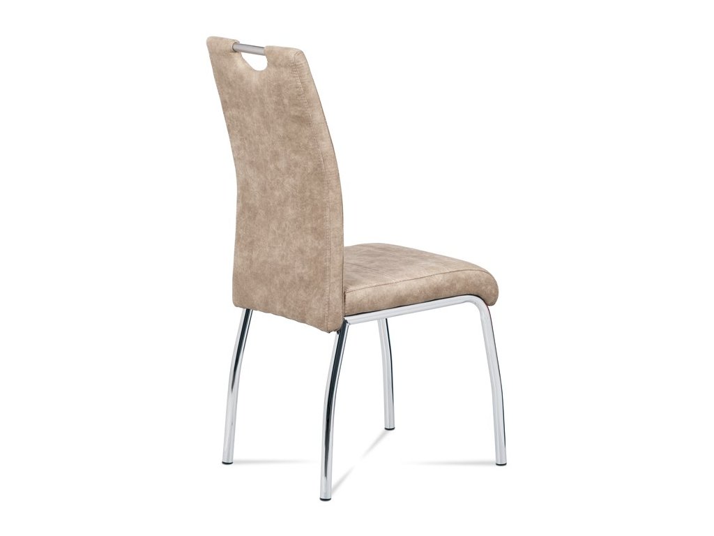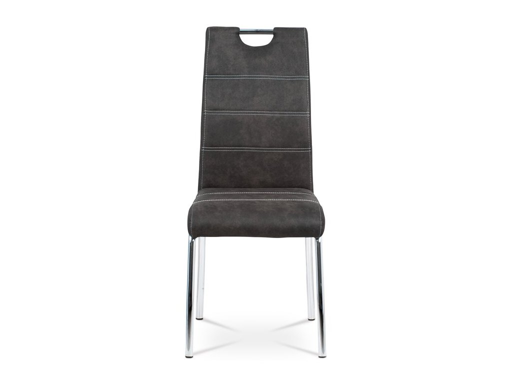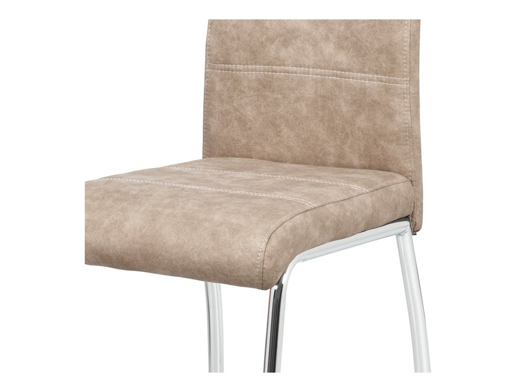 Jedálenská stolička v modernom štýle. Poťah je z elegantnej hnedej látky v dekore vintage brúsenej kože, veľmi príjemnej na dotyk a veľmi ústretovej na bezproblémovú údržbu, s bielym horizontálnym a obvodovým prešitím operadla aj sedadla. Potrebnú stabilitu a pevnosť dodáva mohutná kovová štvornohá podnož s chrómovou úpravou. Nohy sú kruhového prierezu, opatrené plastovými klzákmi, ktoré znížia riziko poškodenia vašej podlahy na minimum. Pre ľahšiu manipuláciu má stolička kovové madlo v hornej časti operadla, čo predstavuje veľmi praktický funkčný doplnok. Stolička svojim mohutným, moderným a praktickým prevedením predstavuje ideálnu voľbu do akéhokoľvek jedálenského kútika, kuchyne či spoločenskej miestnosti.Dodatočné parametre