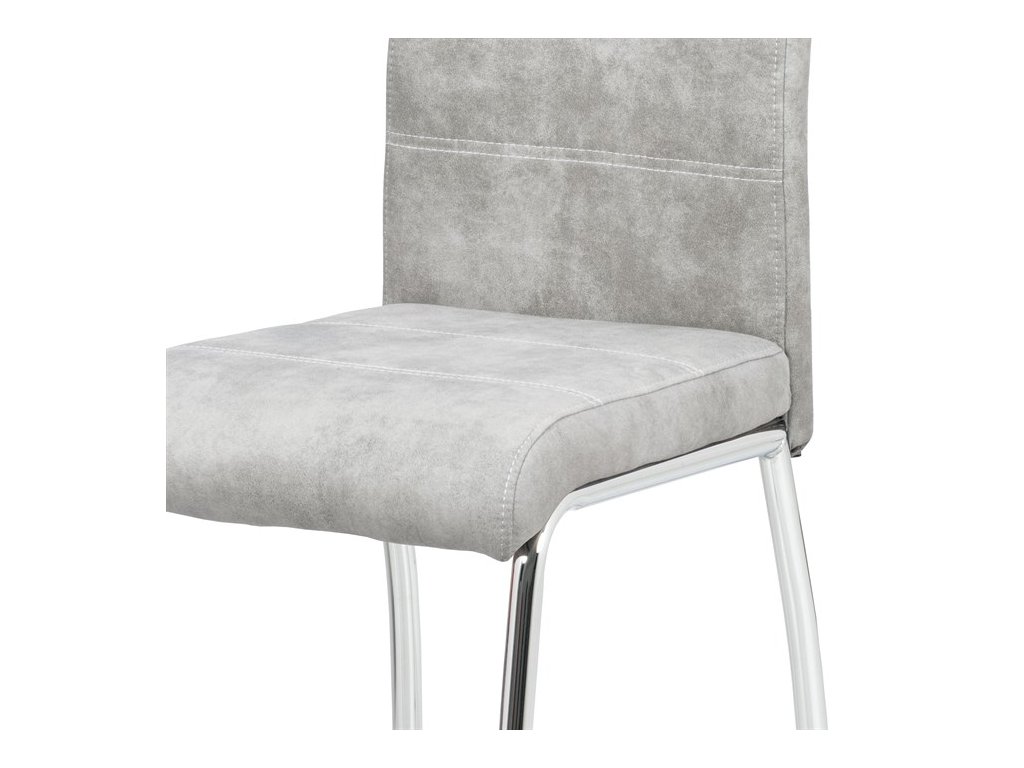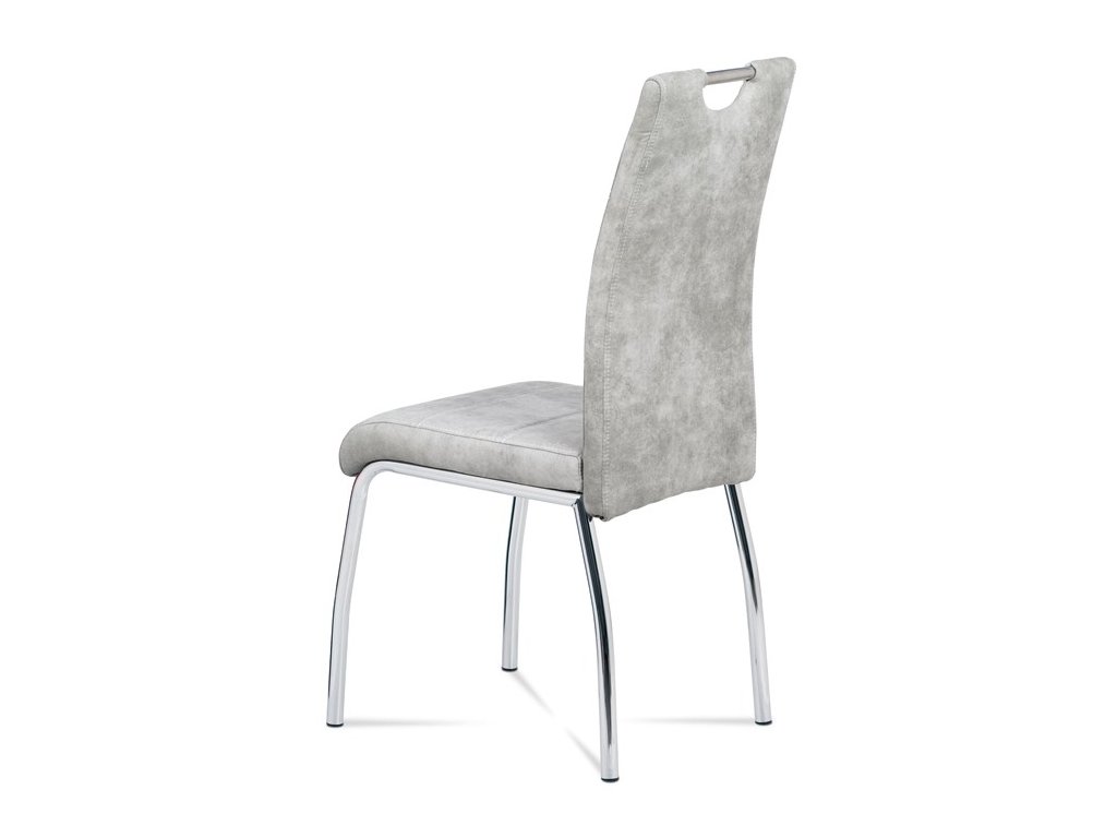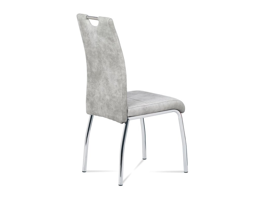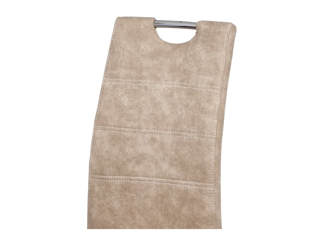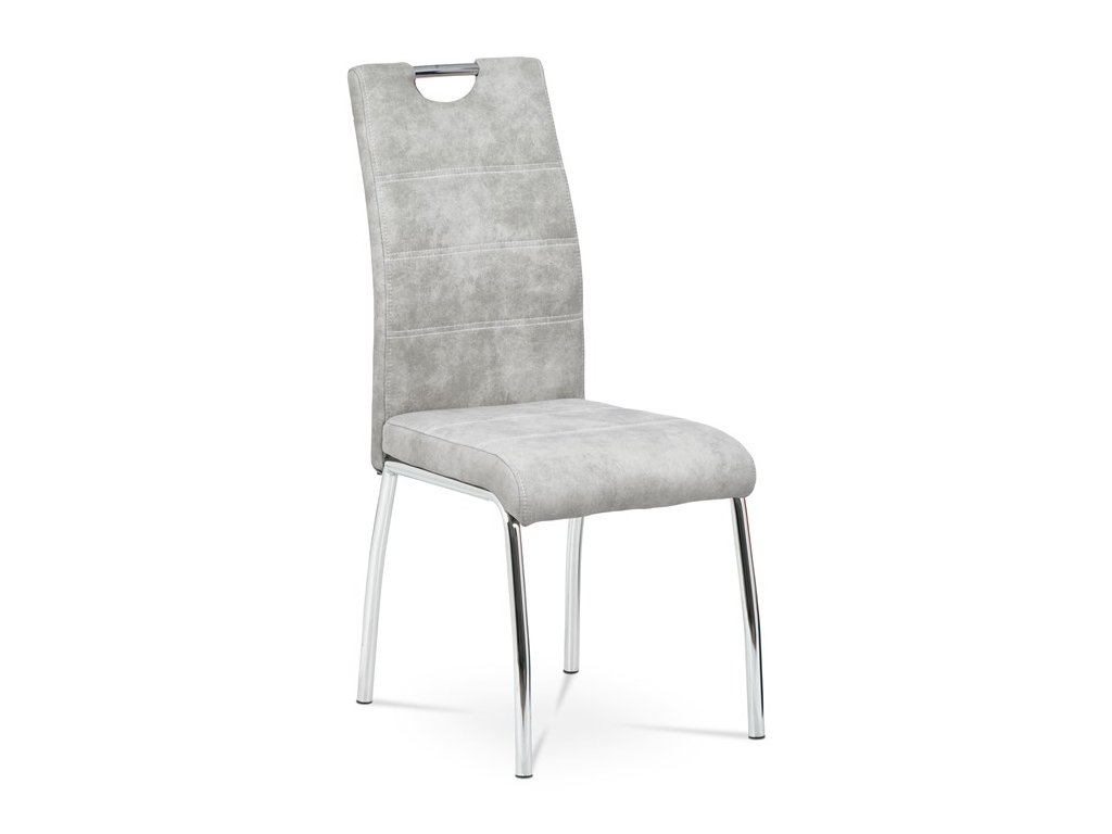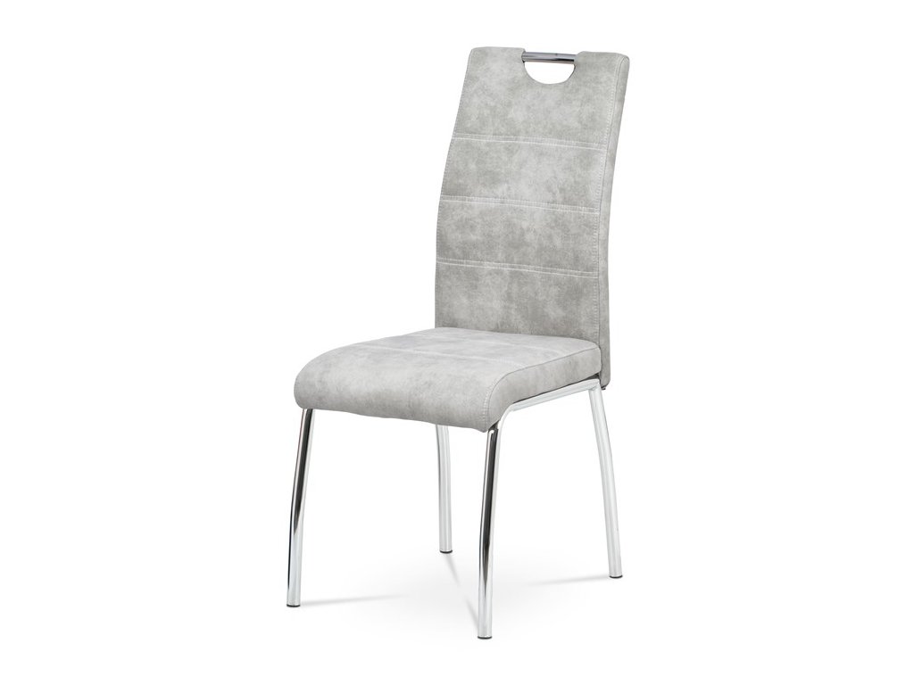 Jedálenská stolička v modernom štýle. Poťah je z elegantnej hnedej látky v dekore vintage brúsenej kože, veľmi príjemnej na dotyk a veľmi ústretovej na bezproblémovú údržbu, s bielym horizontálnym a obvodovým prešitím operadla aj sedadla. Potrebnú stabilitu a pevnosť dodáva mohutná kovová štvornohá podnož s chrómovou úpravou. Nohy sú kruhového prierezu, opatrené plastovými klzákmi, ktoré znížia riziko poškodenia vašej podlahy na minimum. Pre ľahšiu manipuláciu má stolička kovové madlo v hornej časti operadla, čo predstavuje veľmi praktický funkčný doplnok. Stolička svojim mohutným, moderným a praktickým prevedením predstavuje ideálnu voľbu do akéhokoľvek jedálenského kútika, kuchyne či spoločenskej miestnosti.Dodatočné parametre