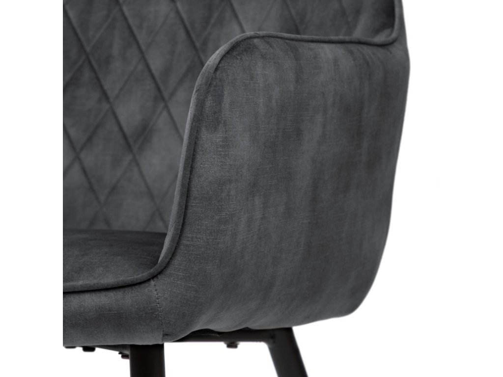 Dizajnová jedálenská stolička, ktorá zaujme na prvý pohľad. Sedadlo aj operadlo sú potiahnuté odolným čalúnením s elegantným dekoratívnym prešívaním v tvare kosoštvorcov, ktoré dodáva stoličke luxusný vzhľad. Ergonomický tvar operadla a pohodlné podrúčky poskytujú maximálny komfort pri sedení.