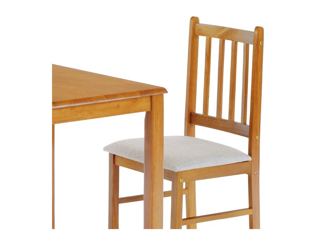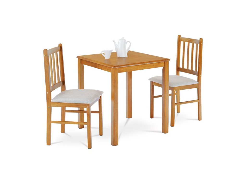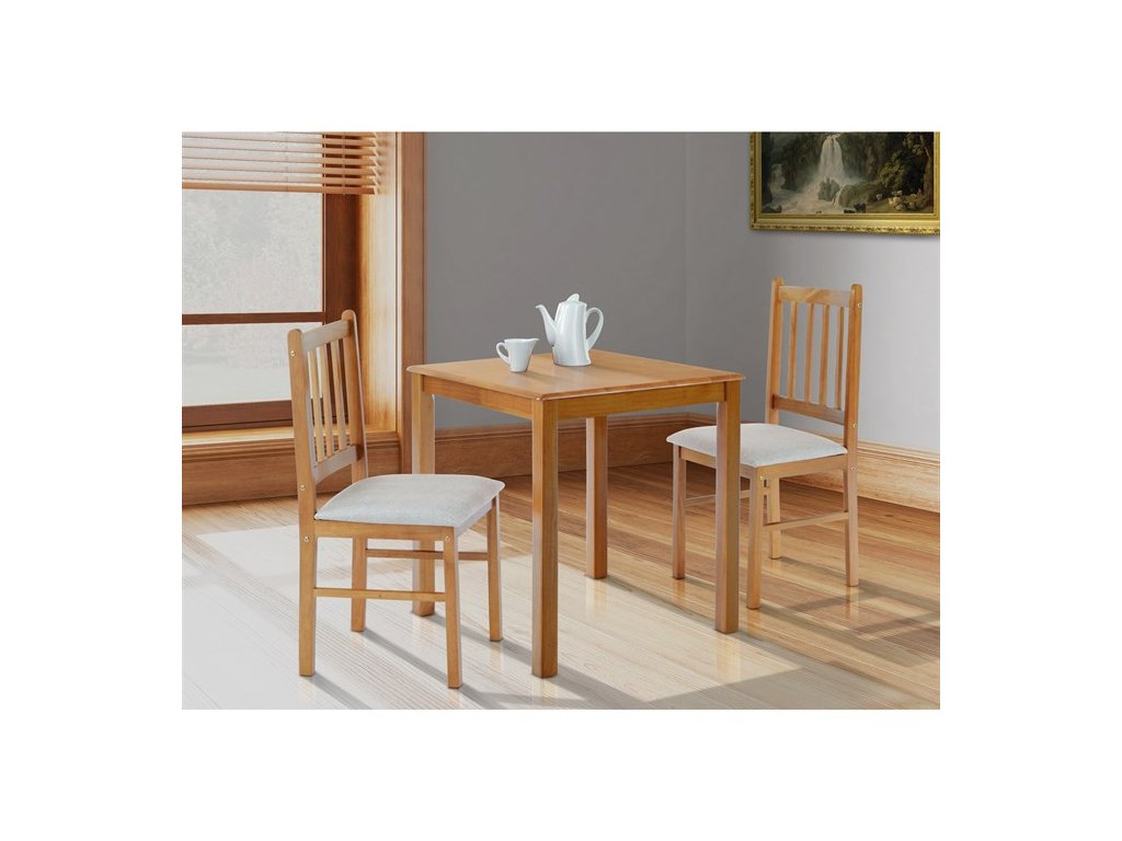 Jedálenský set v štýle landhaus v minimalistickom prevedení. Je zložený zo štvorcového jedálenského stola a dvoch jedálenských stoličiek. Stôl je o rozmere 69 x 69 x 75 cm. Doska a nohy sú vyrobené z masívneho kaučukovníkového dreva. Celý stôl je morený do odtieňa dub landhaus. Použitý materiál zaisťuje dostatočnú pevnosť aj stabilitu celého stola. Stoličky sú vyrobené aj z masívneho kaučukovníka v povrchovej úprave dub landhaus. Sedák je polstrovaný kvalitnou PU penou a potiahnutý stredne hrubou látkou v šedobéžovom trendy odtieni. Nosnosť stoličky je až 110 kg.