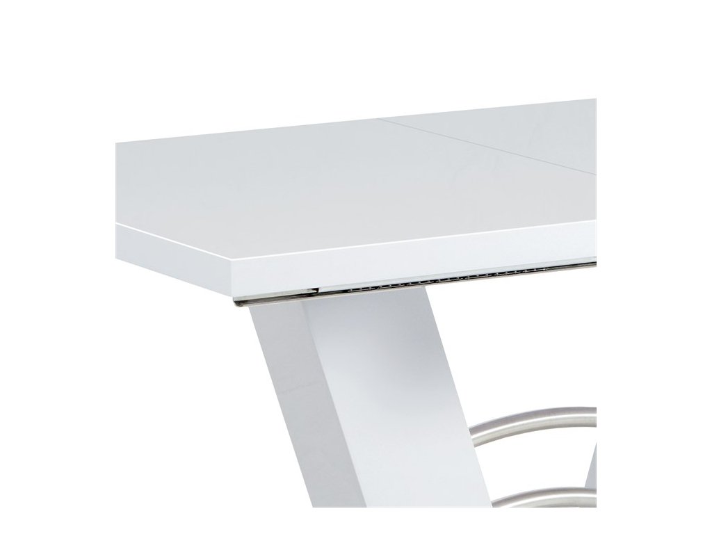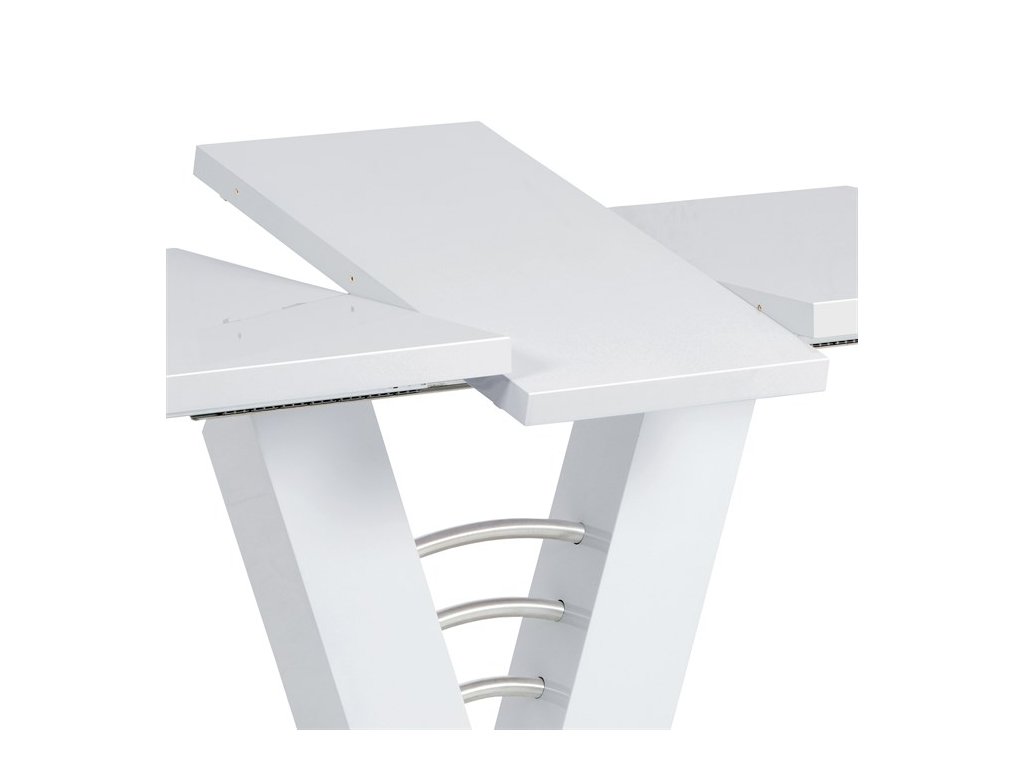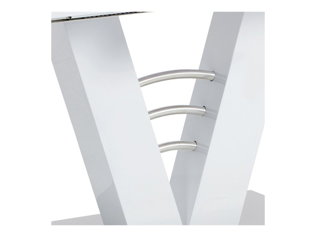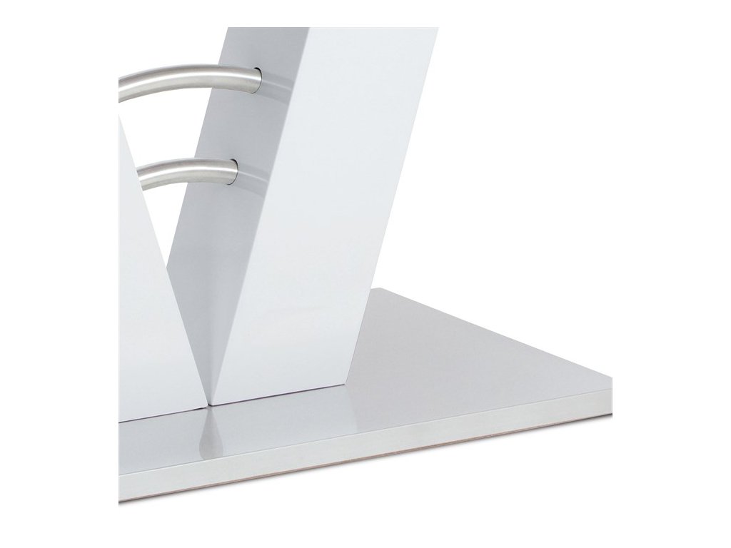 Dizajnový jedálenský stôl na zaujímavo riešenej podnoži s podstavou a doplnkami z brúseného nerezu. Moderný biely lesk v kombinácii s brúseným nerezom vyzerá veľmi prepychovo. Odporúčame kombinovať so stoličkami, ktoré majú podnož z brúseného nerezu. MDF doska bielej farby má hrúbku 4 cm.Dodatočné parametre