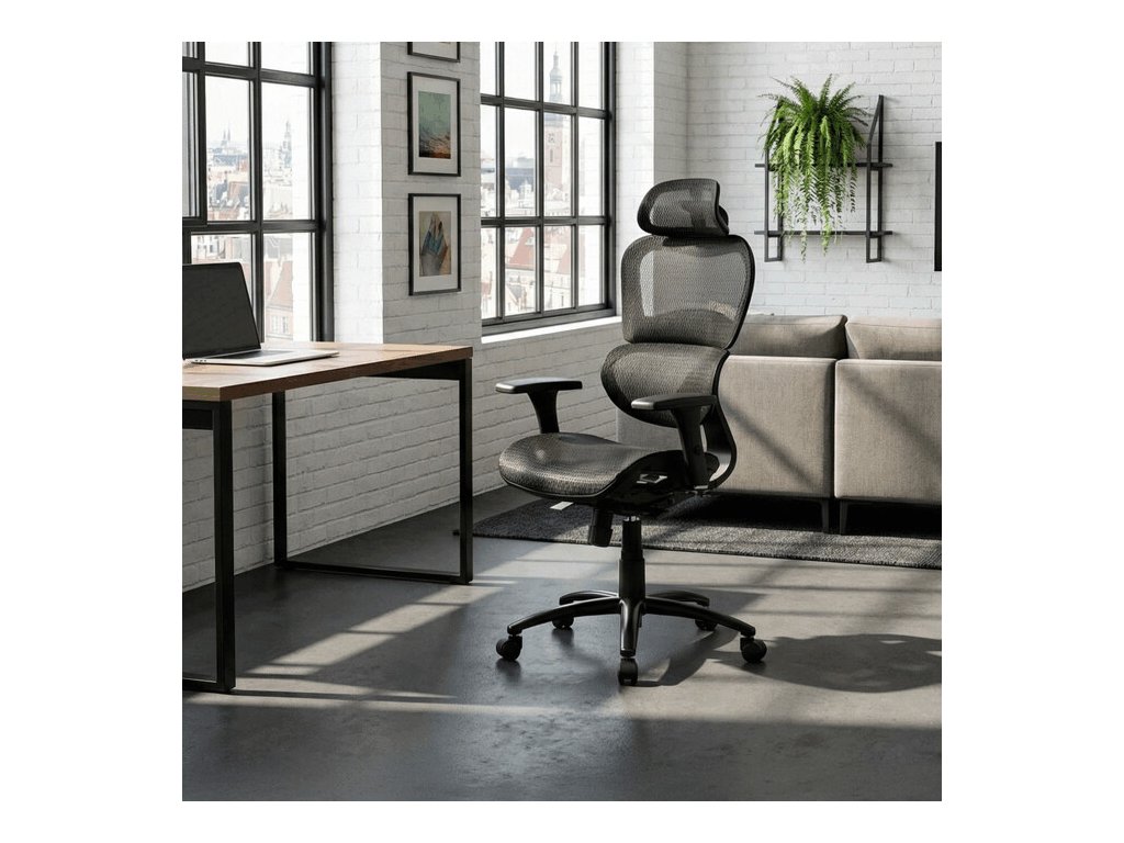 Dizajnová kancelárska stolička v kategórii TOP manager. Poťah je zo sieťoviny MESH v čiernej farbe. Synchrónny mechanizmus je možné aretovať v niekoľkých polohách. Podrúčky umožňujú nastaviť výšku aj posúvať mäkčené opierky vpred a vzad. Opierka hlavy je horizontálne aj vertikálne nastaviteľná. Kríž je kovový, čierny matný a kolieska univerzálne. Operadlo je priedušné a špeciálne ergonomicky tvarované pre správne a zdravé držanie chrbta aj pri náročnej kancelárskej práci.
