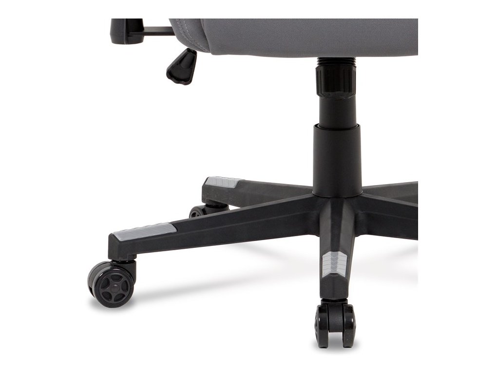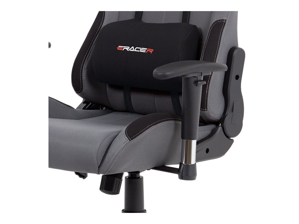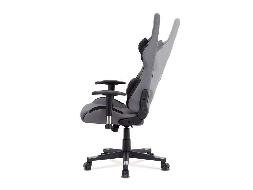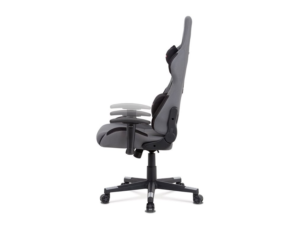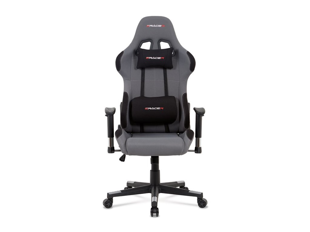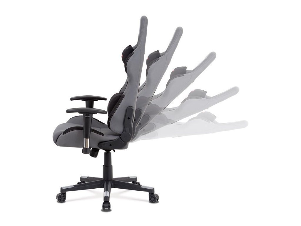 Herné kreslo v športovom dizajne v sivej vzdušnej látke s čiernymi detailmi a štýlovým prešitím sa stane nevyhnutným doplnkom každého PC pretekára. Polohovacie operadlo ktoré možno sklopiť až na 180 ° spolu s otočným/hojdacím mechanizmom, ovládaným identicky ako v športovom aute, zabezpečí pevné komfortné sedenie, ktorému je nápomocný bedrový vankúšik a vankúšik pod hlavu, ktoré možno podľa potreby posúvať alebo úplne odobrať. Stolička má nastaviteľné podrúčky, masívny nosný kríž s elegantnými protišmykovými doplnkami, ktorý zabezpečí potrebnú stabilitu plus jedinečný dizajnový prvok - efektné otvory na operadle.