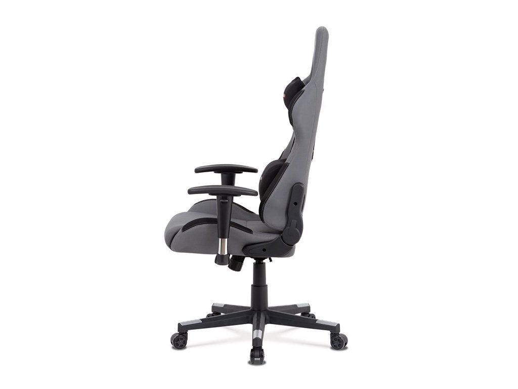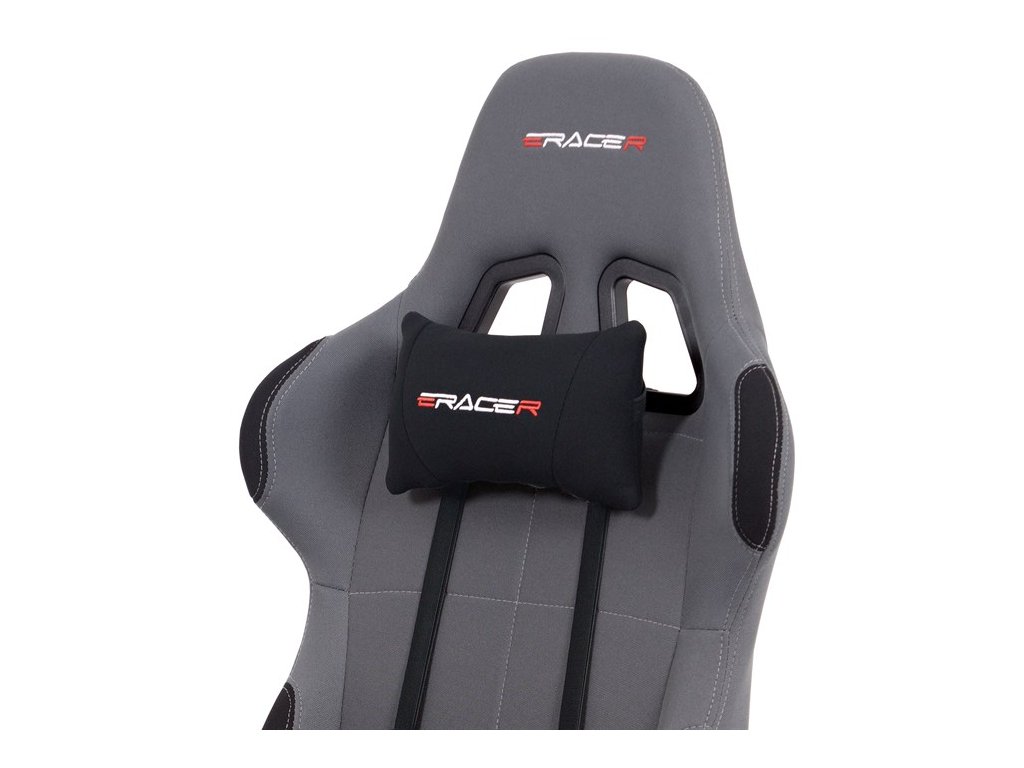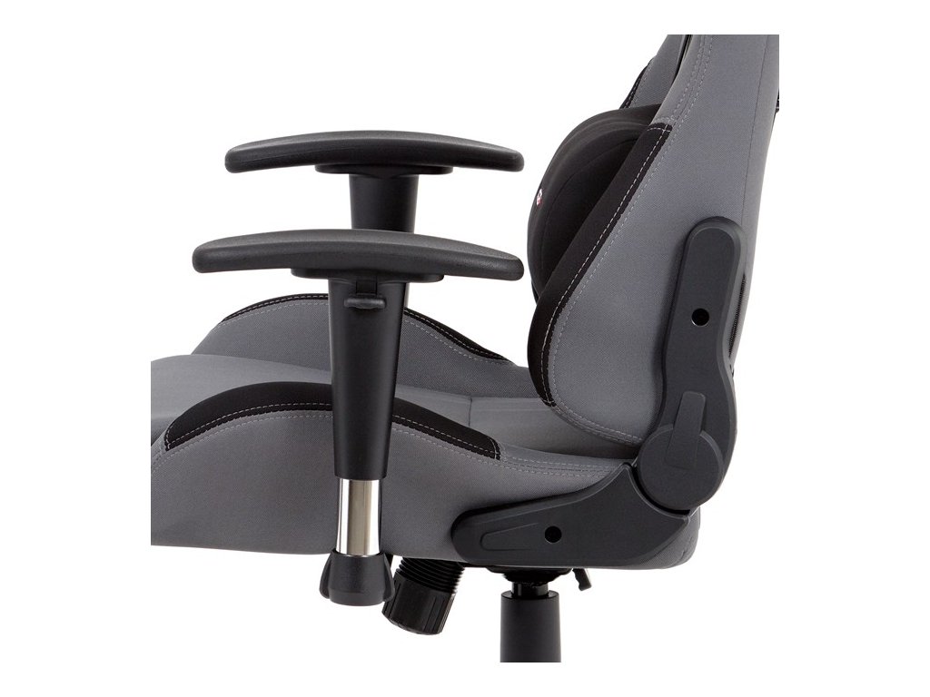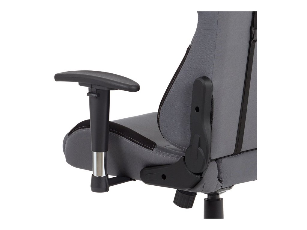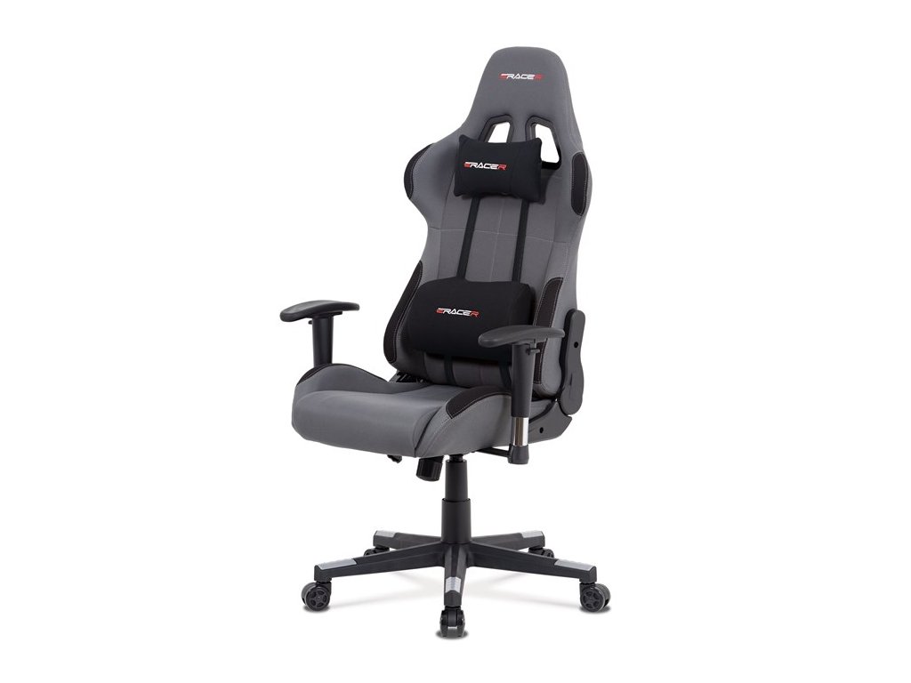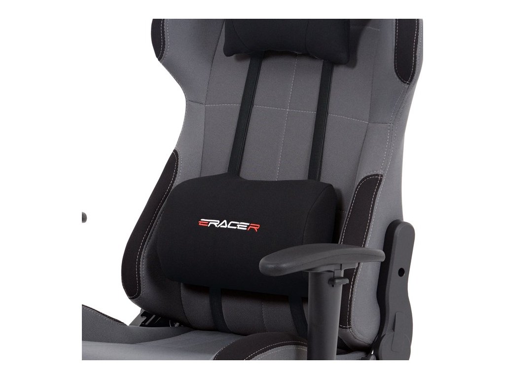 Herné kreslo v športovom dizajne v sivej vzdušnej látke s čiernymi detailmi a štýlovým prešitím sa stane nevyhnutným doplnkom každého PC pretekára. Polohovacie operadlo ktoré možno sklopiť až na 180 ° spolu s otočným/hojdacím mechanizmom, ovládaným identicky ako v športovom aute, zabezpečí pevné komfortné sedenie, ktorému je nápomocný bedrový vankúšik a vankúšik pod hlavu, ktoré možno podľa potreby posúvať alebo úplne odobrať. Stolička má nastaviteľné podrúčky, masívny nosný kríž s elegantnými protišmykovými doplnkami, ktorý zabezpečí potrebnú stabilitu plus jedinečný dizajnový prvok - efektné otvory na operadle.