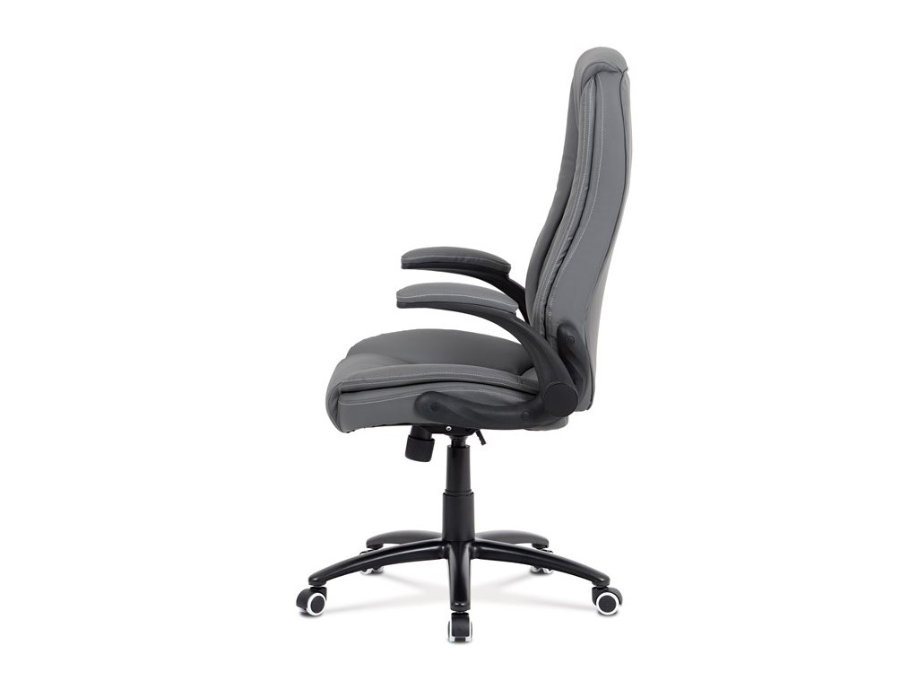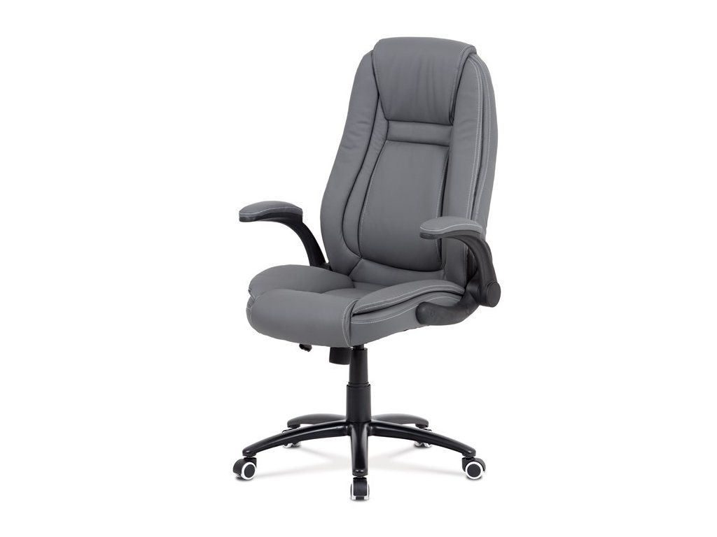 Moderná kancelárska stolička čalúnená jemnou ekokožou sivej farby, veľmi príjemnou na dotyk a zároveň jednoduchou na údržbu. Vďaka pohodlnému a štýlovo tvarovanému sedadlu a operadlu s elegantným prešitím a s veľmi mäkkým podhlavníkom sa budete cítiť maximálne pohodlne. Ruky si môžete pohodlne oprieť o odklápacie podrúčky čiernej farby s polstrovaním čalúneným sivou ekokožou. Stolička má ľahko umývateľný zosilnený kovový kríž matnej čiernej farby. Mechanizmus stoličky je zdvíhací a hojdací s možnosťou regulácie tuhosti hojdania.Dodatočné parametre