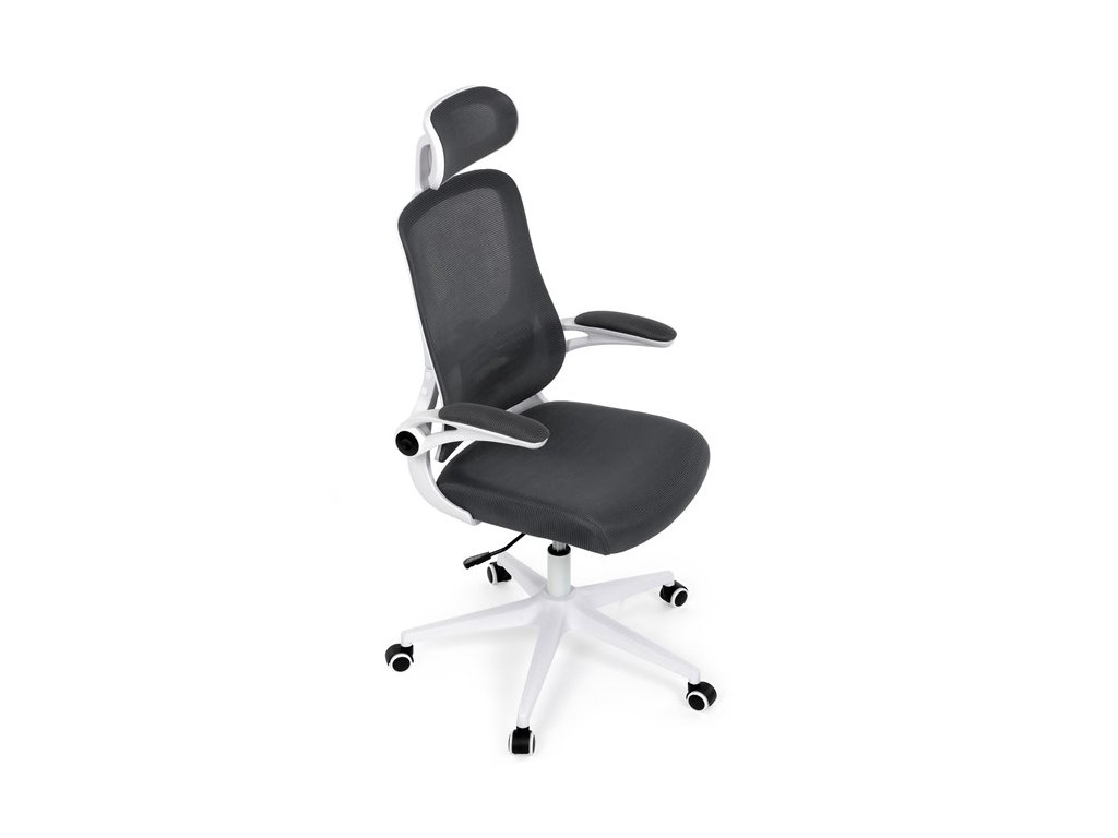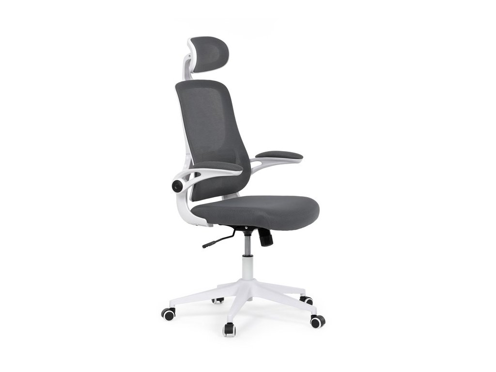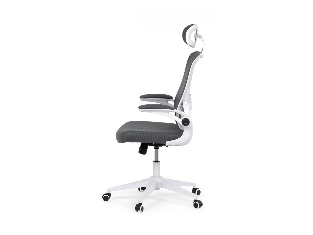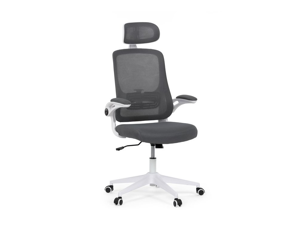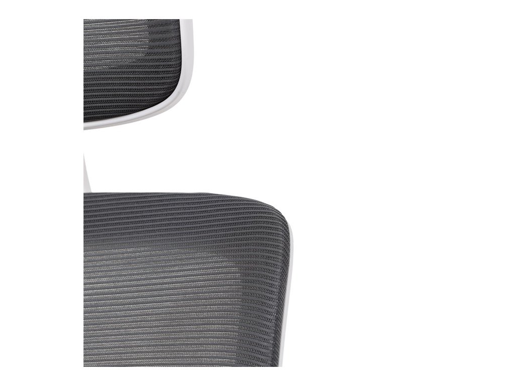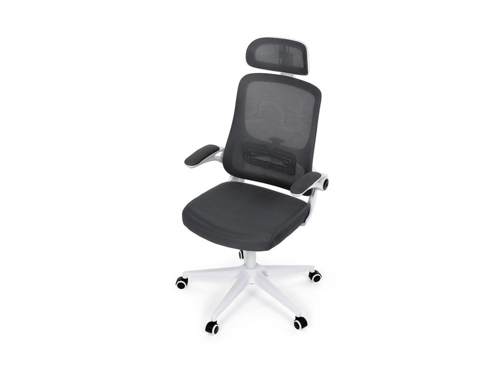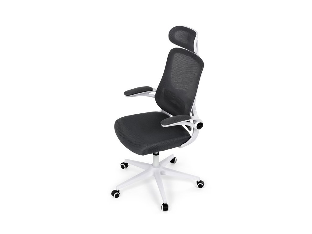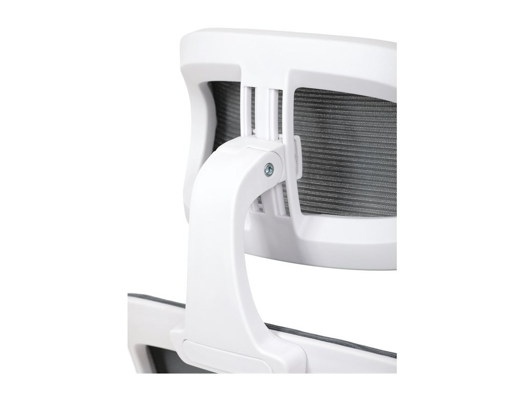 Stolička vyrobená s dôrazom na modernú estetiku, spája v sebe jednoduchý ale aktuálny dizajn spolu s praktickou funkčnosťou. Základ stoličky tvorí plastová kostra v elegantnej bielej farbe, Sedák je zo sivej odolnej látky MESH, ktorá bez problémov zvládne časté používanie, operadlo zo vzdušnej ale pevnej sieťoviny, ktorá spríjemní čas strávený pri sedení. V operadle je nenápadne integrovaná bedrová opierka na zvýšenie komfortu sedenia, ktoré je maximálne umocnené nastaviteľnou hlavovou opierkou Výklopné podrúčky okrem estetickej úlohy plnia samozrejme aj nezanedbateľnú funkčnú. Stolička ako celok pôsobí veľmi kompaktne, svojím vzhľadom a funkčnosťou ľahko zapadne do prostredia domova aj kancelárie.