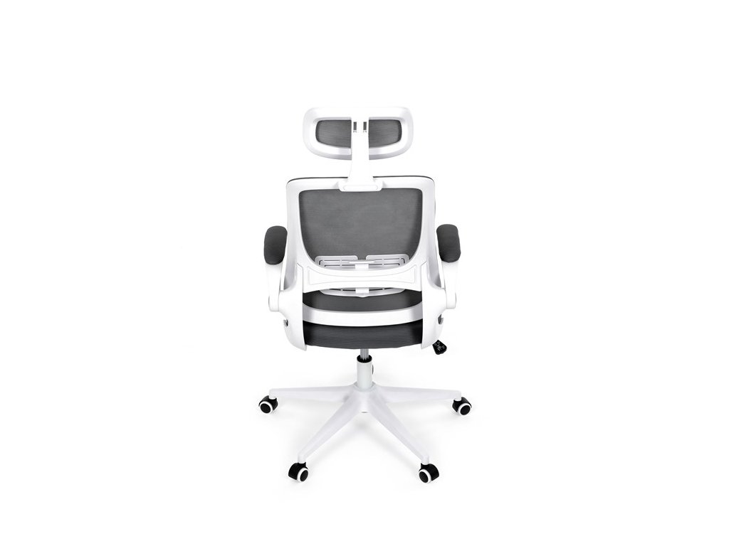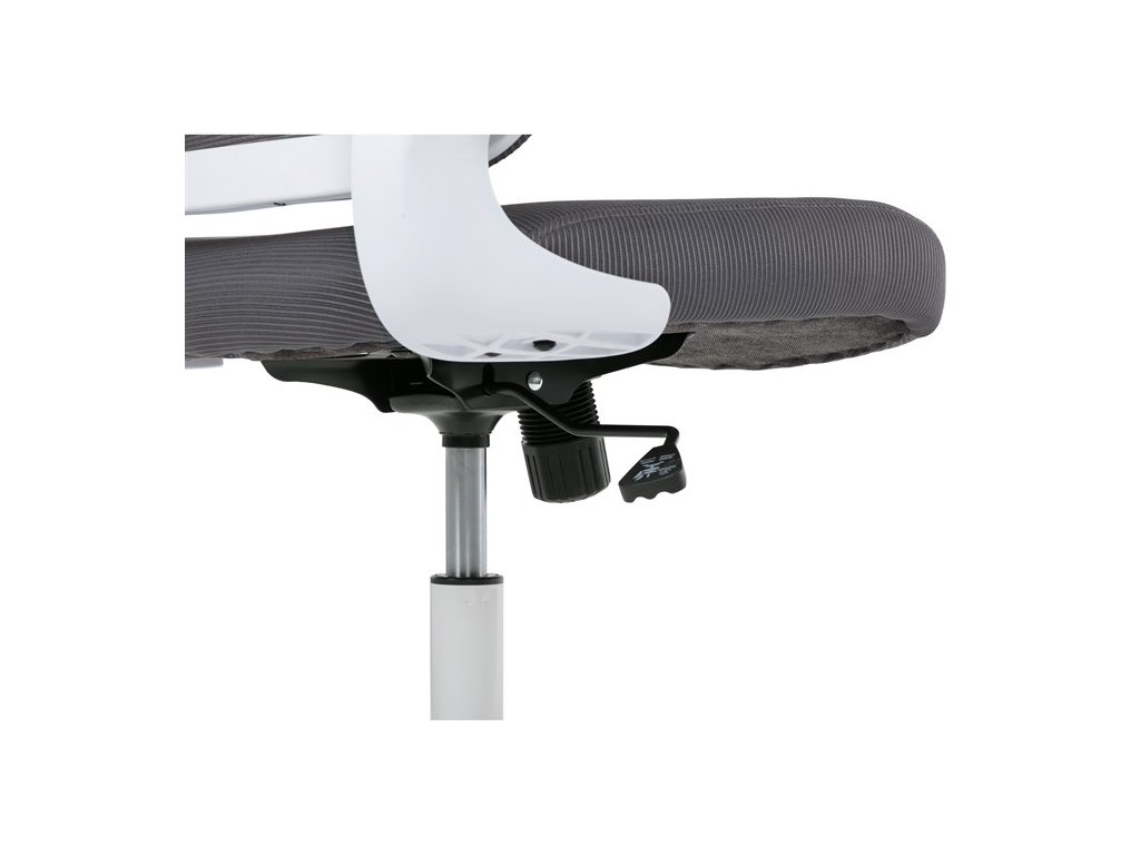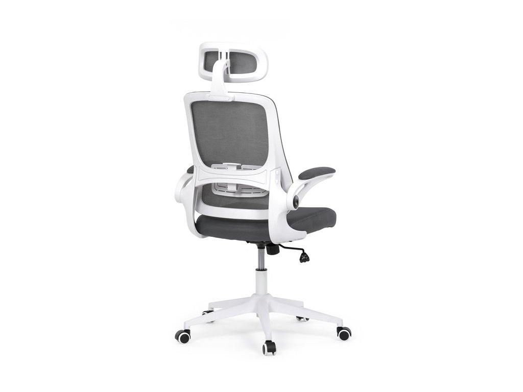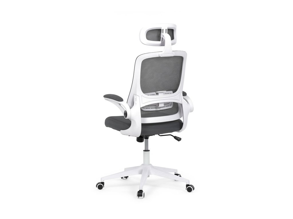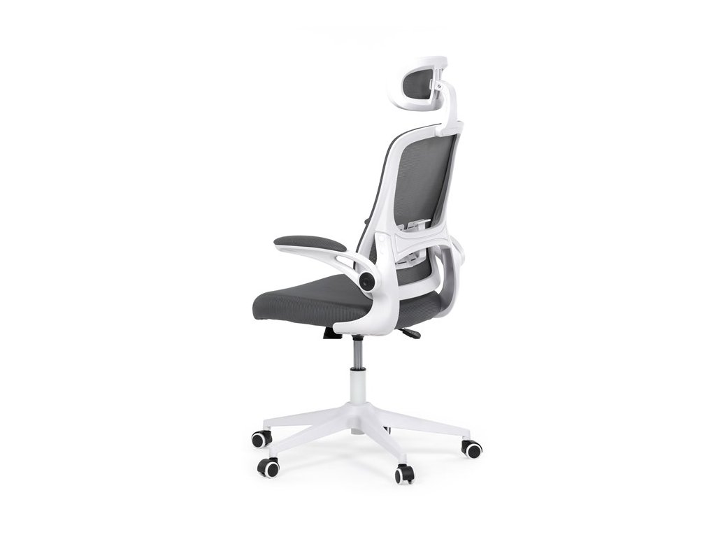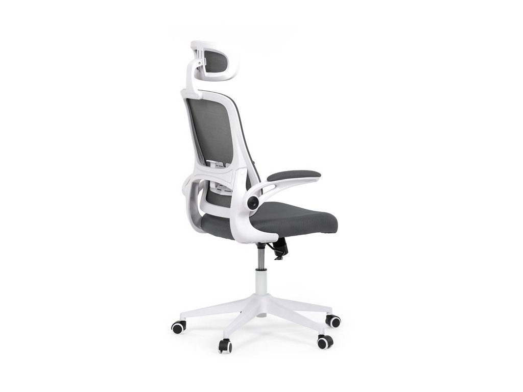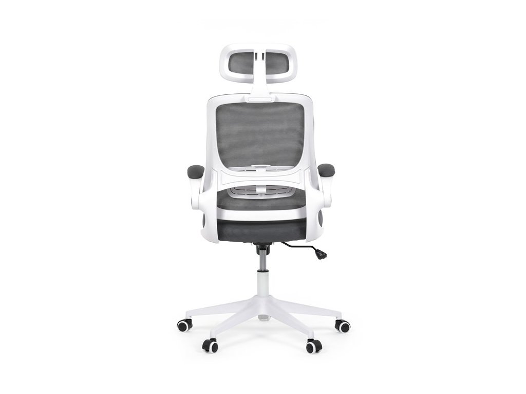 Stolička vyrobená s dôrazom na modernú estetiku, spája v sebe jednoduchý ale aktuálny dizajn spolu s praktickou funkčnosťou. Základ stoličky tvorí plastová kostra v elegantnej bielej farbe, Sedák je zo sivej odolnej látky MESH, ktorá bez problémov zvládne časté používanie, operadlo zo vzdušnej ale pevnej sieťoviny, ktorá spríjemní čas strávený pri sedení. V operadle je nenápadne integrovaná bedrová opierka na zvýšenie komfortu sedenia, ktoré je maximálne umocnené nastaviteľnou hlavovou opierkou Výklopné podrúčky okrem estetickej úlohy plnia samozrejme aj nezanedbateľnú funkčnú. Stolička ako celok pôsobí veľmi kompaktne, svojím vzhľadom a funkčnosťou ľahko zapadne do prostredia domova aj kancelárie.