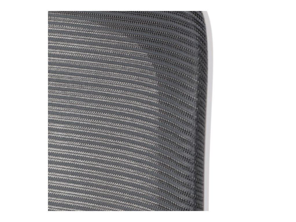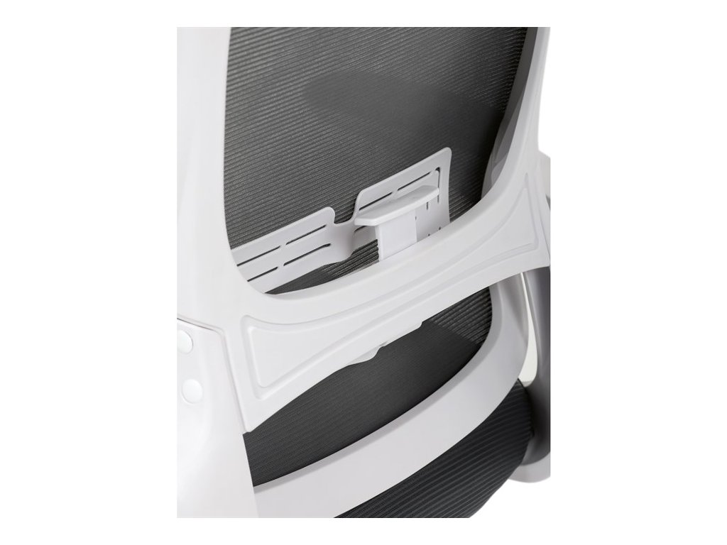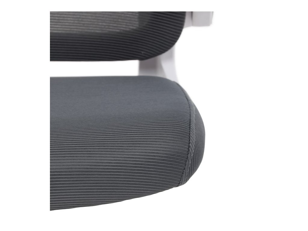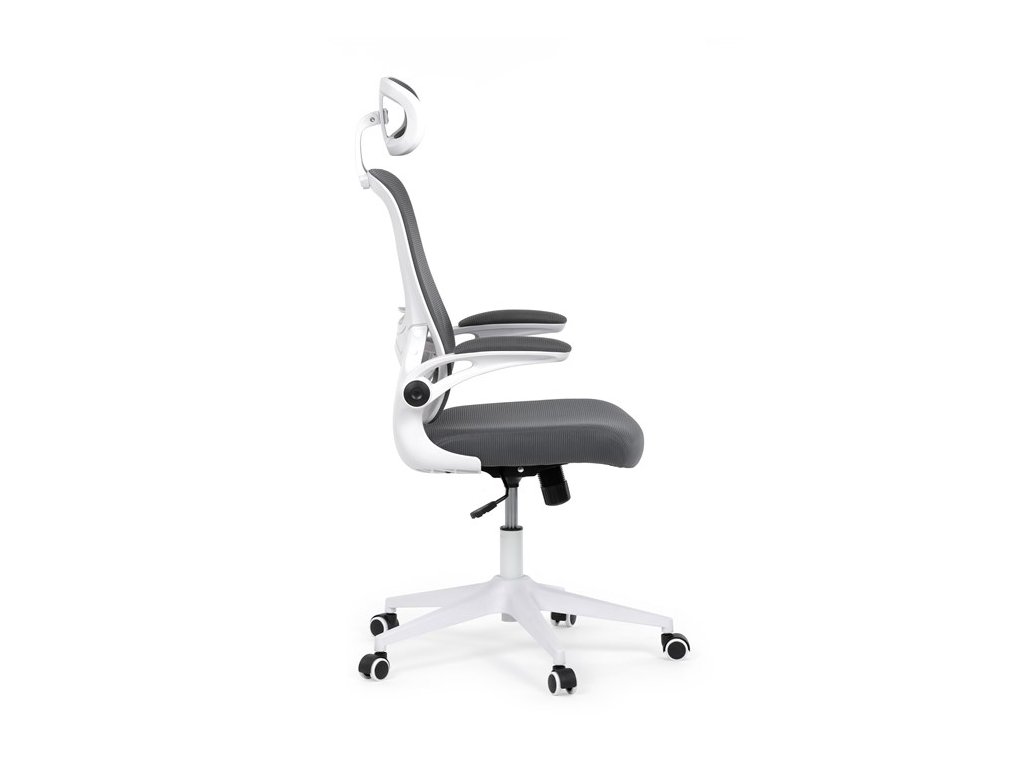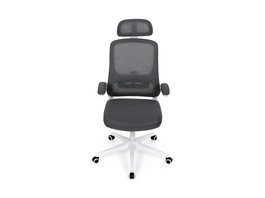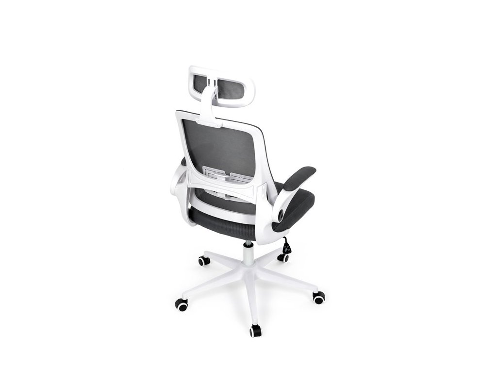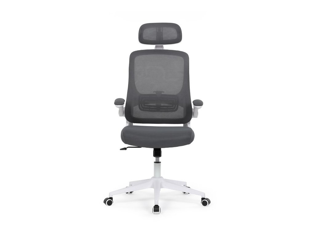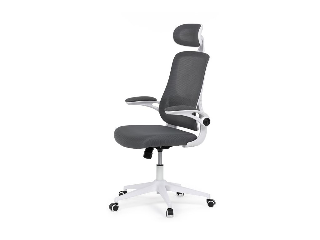 Stolička vyrobená s dôrazom na modernú estetiku, spája v sebe jednoduchý ale aktuálny dizajn spolu s praktickou funkčnosťou. Základ stoličky tvorí plastová kostra v elegantnej bielej farbe, Sedák je zo sivej odolnej látky MESH, ktorá bez problémov zvládne časté používanie, operadlo zo vzdušnej ale pevnej sieťoviny, ktorá spríjemní čas strávený pri sedení. V operadle je nenápadne integrovaná bedrová opierka na zvýšenie komfortu sedenia, ktoré je maximálne umocnené nastaviteľnou hlavovou opierkou Výklopné podrúčky okrem estetickej úlohy plnia samozrejme aj nezanedbateľnú funkčnú. Stolička ako celok pôsobí veľmi kompaktne, svojím vzhľadom a funkčnosťou ľahko zapadne do prostredia domova aj kancelárie.