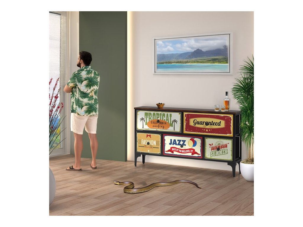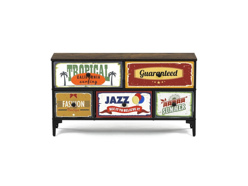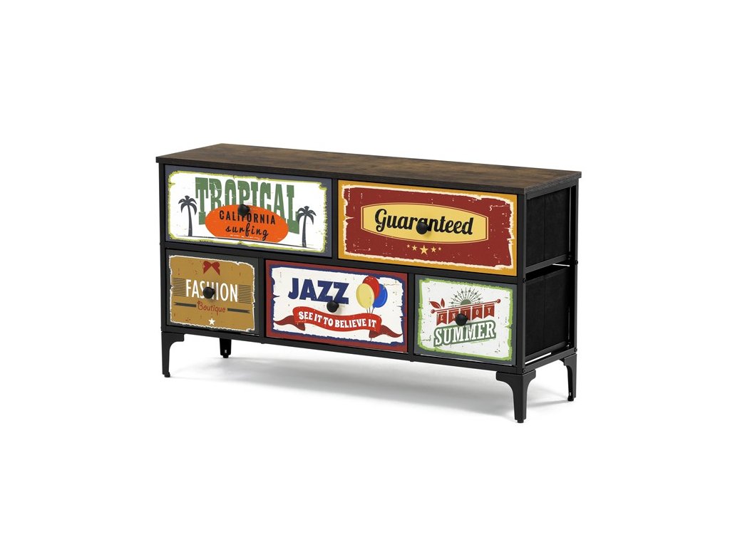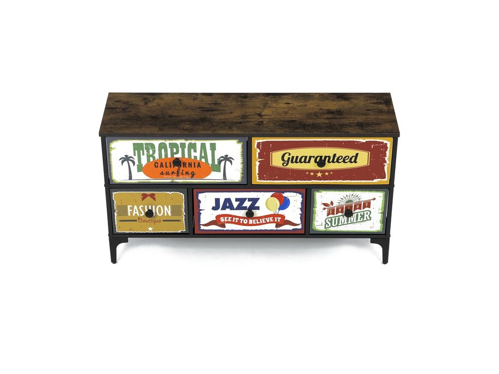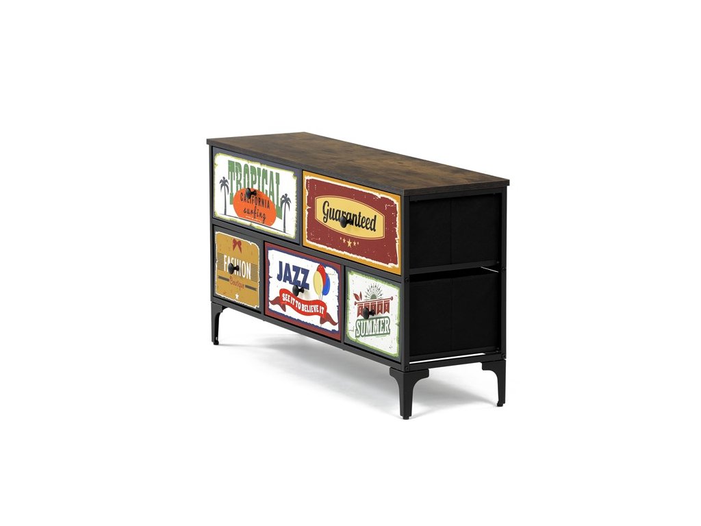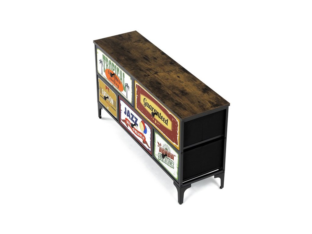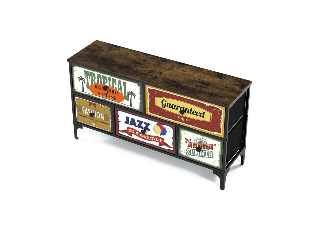Retro komoda prinesie do vášho interiéru osobitosť a dávku nostalgie. Farebné čelá zásuviek s vintage potlačou „Tropical“, „Jazz“, „Summer“ či „Guaranteed“ evokujú atmosféru amerických barov a plážových klubov.Pevná kovová konštrukcia v čiernom prevedení v kombinácii s doskou v dekore starého dreva vytvára harmonické spojenie retra a industriálneho štýlu. Zásuvky z netkanej textílie s výplňou HDF sú ľahké, no odolné a ľahko sa s nimi manipuluje.