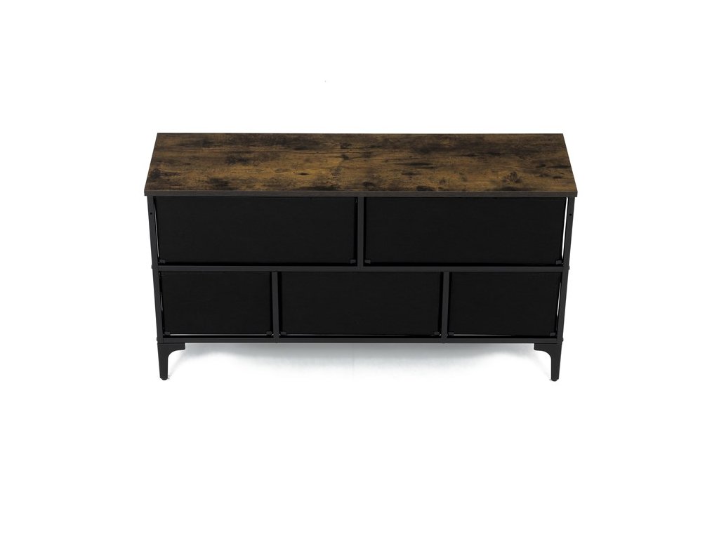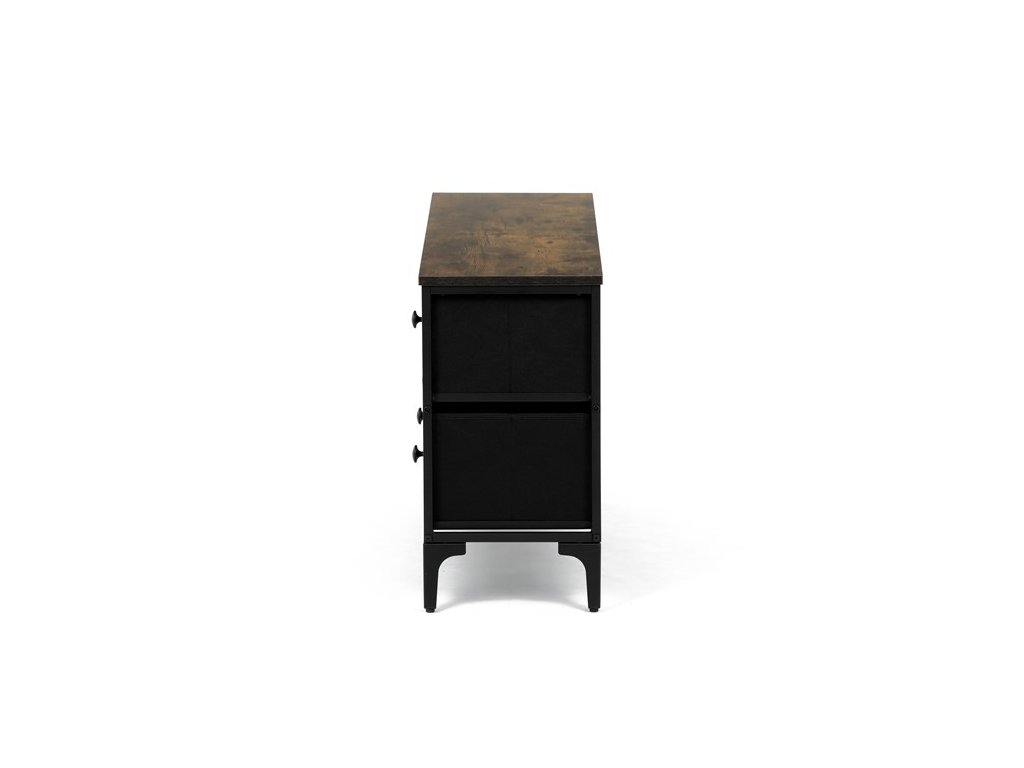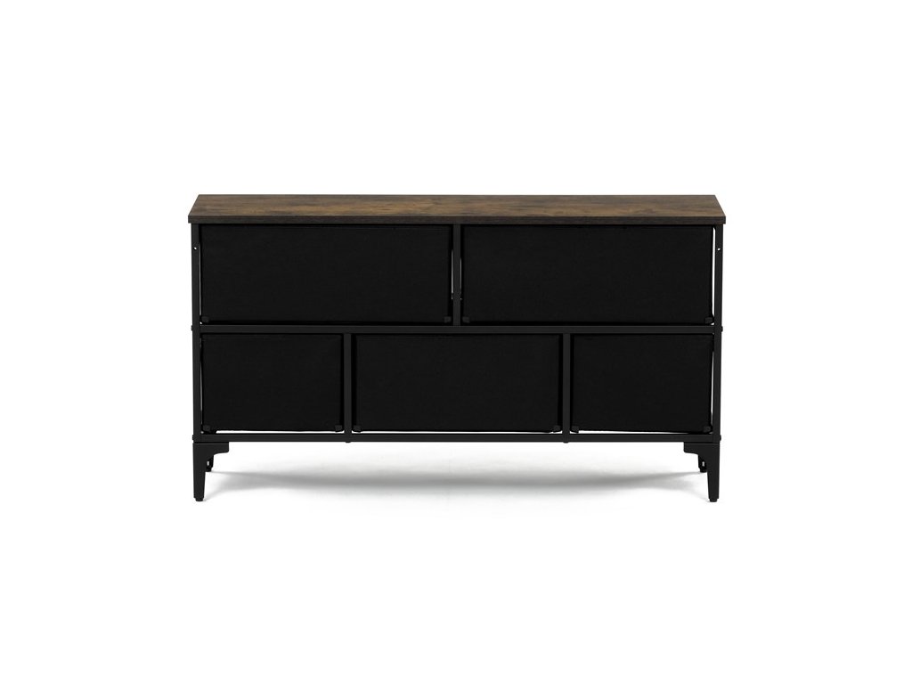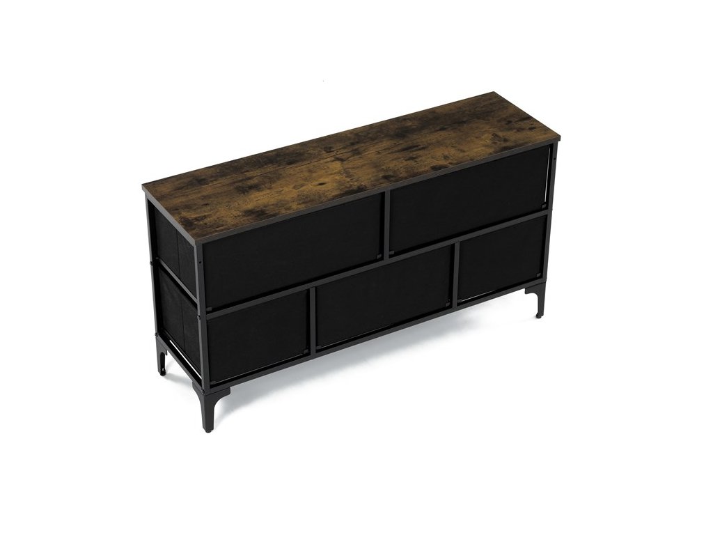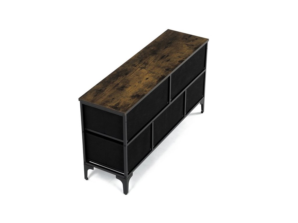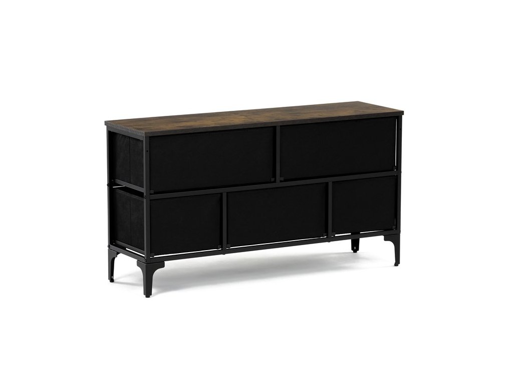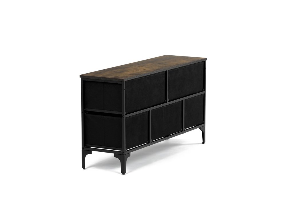 Retro komoda prinesie do vášho interiéru osobitosť a dávku nostalgie. Farebné čelá zásuviek s vintage potlačou „Tropical“, „Jazz“, „Summer“ či „Guaranteed“ evokujú atmosféru amerických barov a plážových klubov.Pevná kovová konštrukcia v čiernom prevedení v kombinácii s doskou v dekore starého dreva vytvára harmonické spojenie retra a industriálneho štýlu. Zásuvky z netkanej textílie s výplňou HDF sú ľahké, no odolné a ľahko sa s nimi manipuluje.