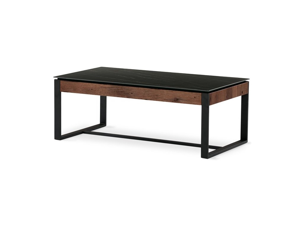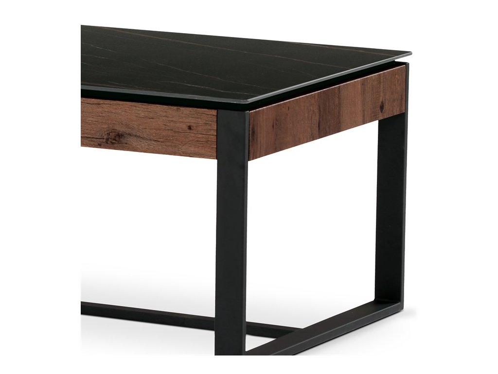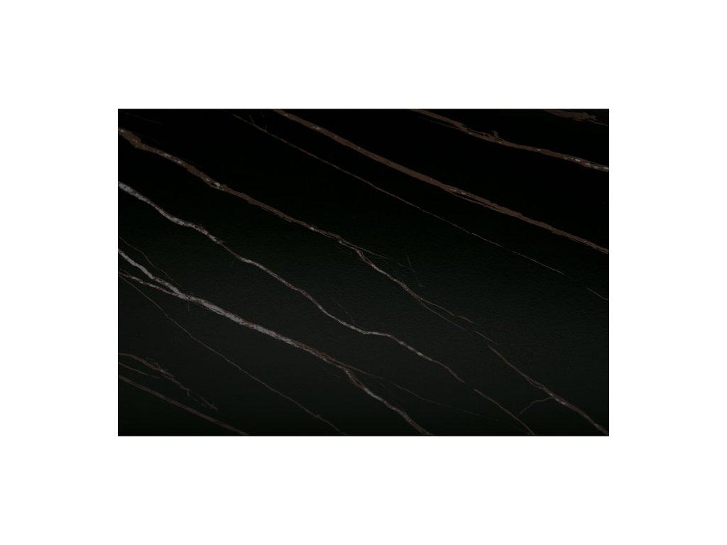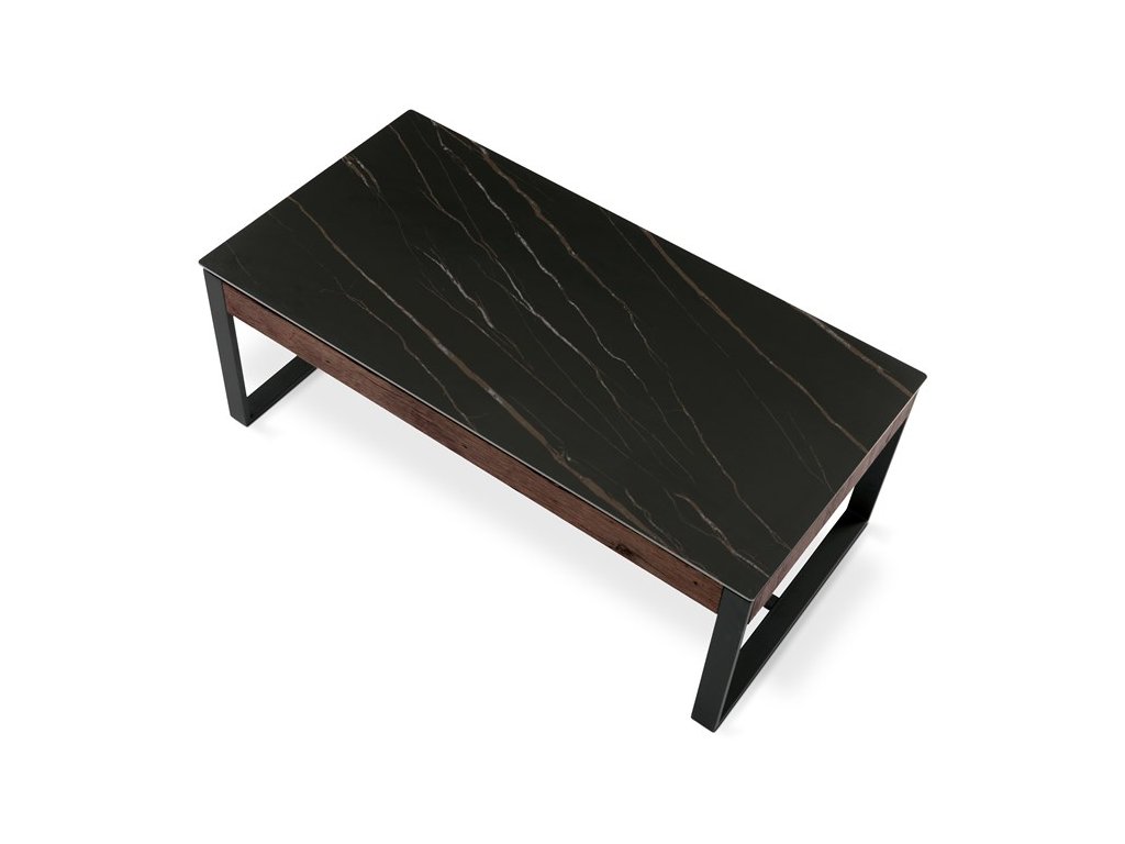 Konferenčný stolík vyrobený z mramorovej dosky čiernej farby, doplnený čiernymi kovovými nohami. Pod doskou po obvode je tmavohnedá dýha, ktorá mu dodáva elegantný výzor.Dodatočné parametre