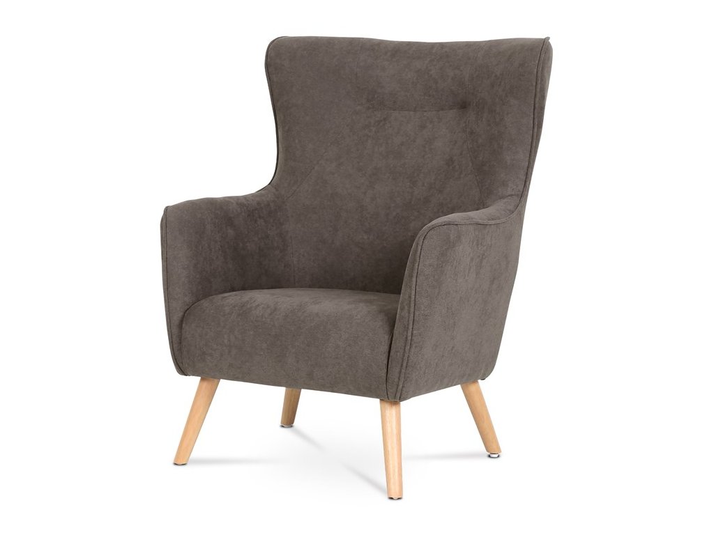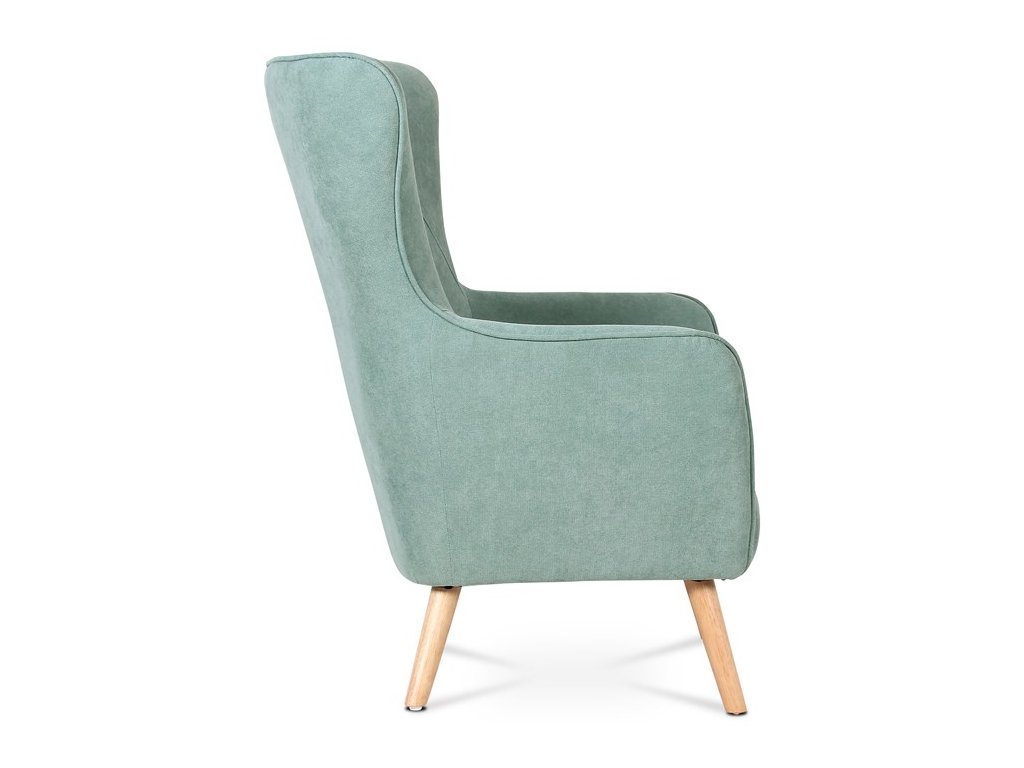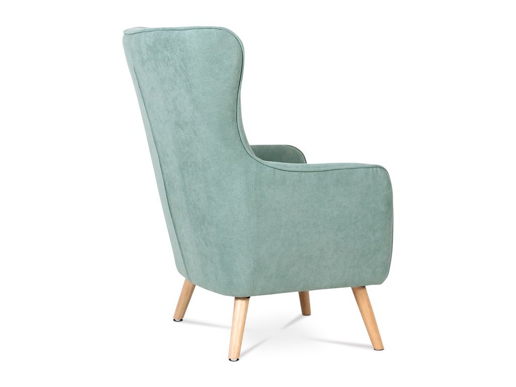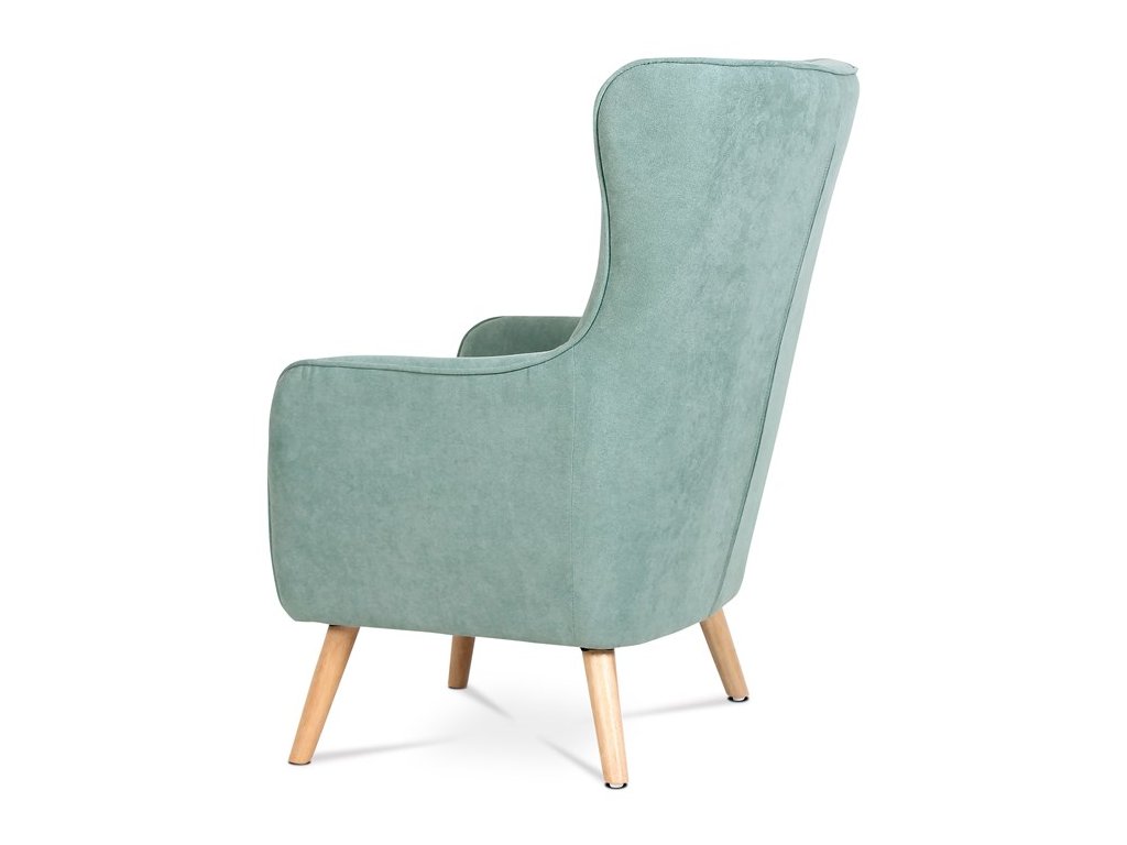 Kreslo ušiak v modernom dizajne, modrá látka, nohy drevený masív.