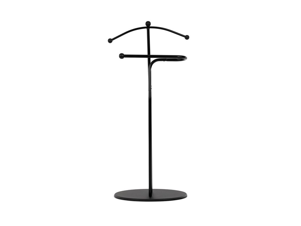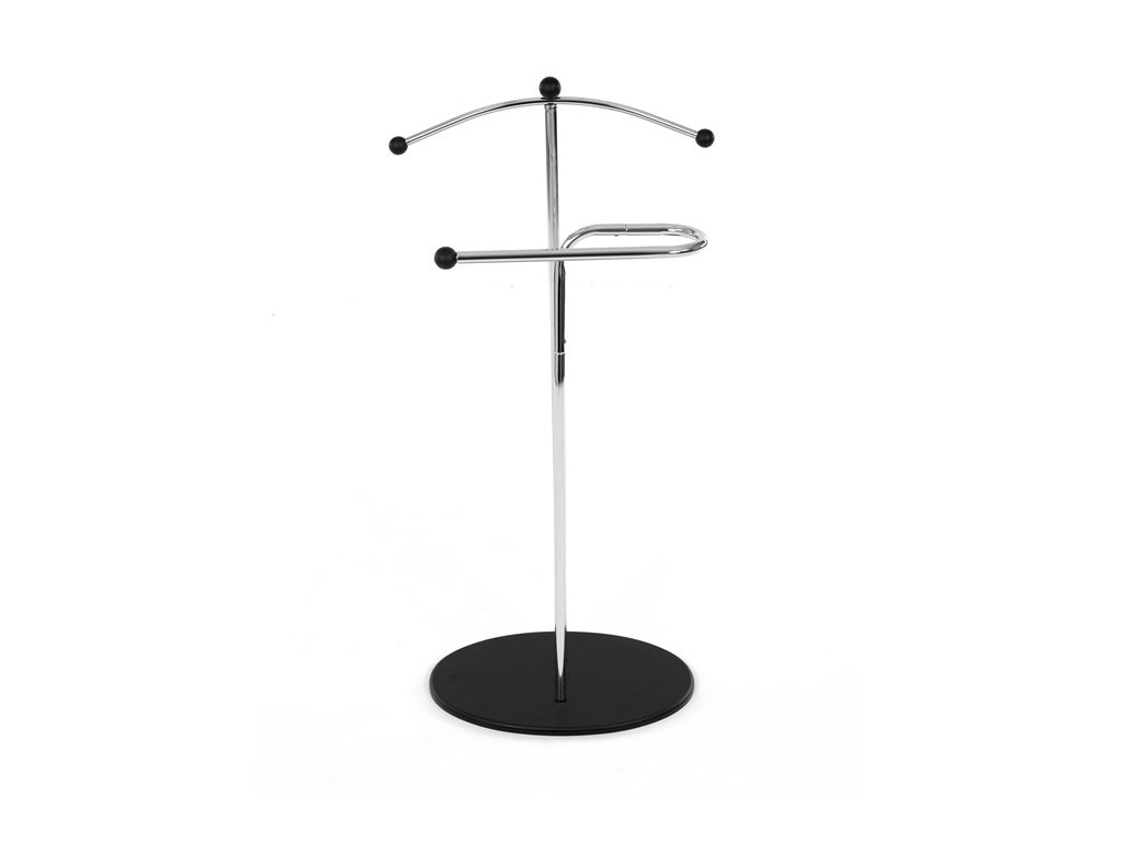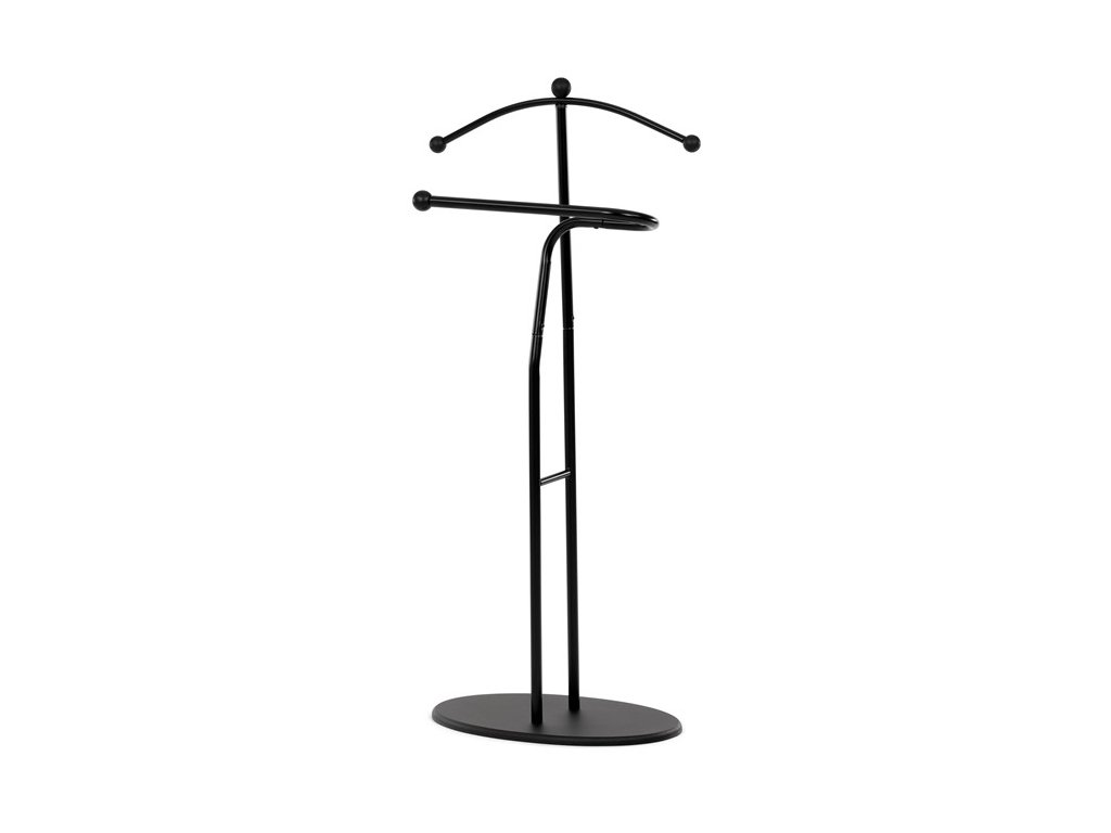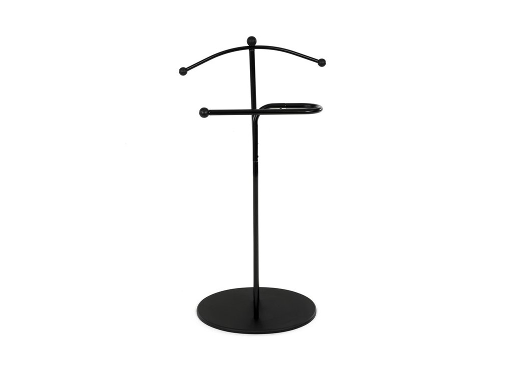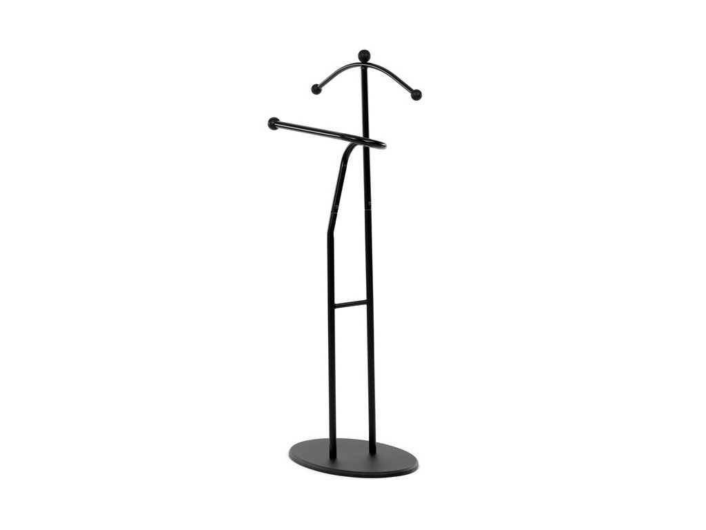 Elegantný nemý sluha v minimalistickom prevedení je ideálnym doplnkom do spálne alebo šatne. Kovová konštrukcia v čiernom prevedení zabezpečuje pevnosť, odolnosť a dlhú životnosť, pričom štíhly dizajn pôsobí moderne a nadčasovo.Ramienko na zavesenie saka alebo košele dopĺňa praktický držiak na nohavice či kravaty. Vďaka stabilnej oválnej základni stojí pevne na mieste a nezaberá veľa priestoru, takže sa hodí aj do menších interiérov. Kombinácia funkčnosti a štýlového vzhľadu robí z tohto nemého sluhu praktického pomocníka na každodenné používanie.