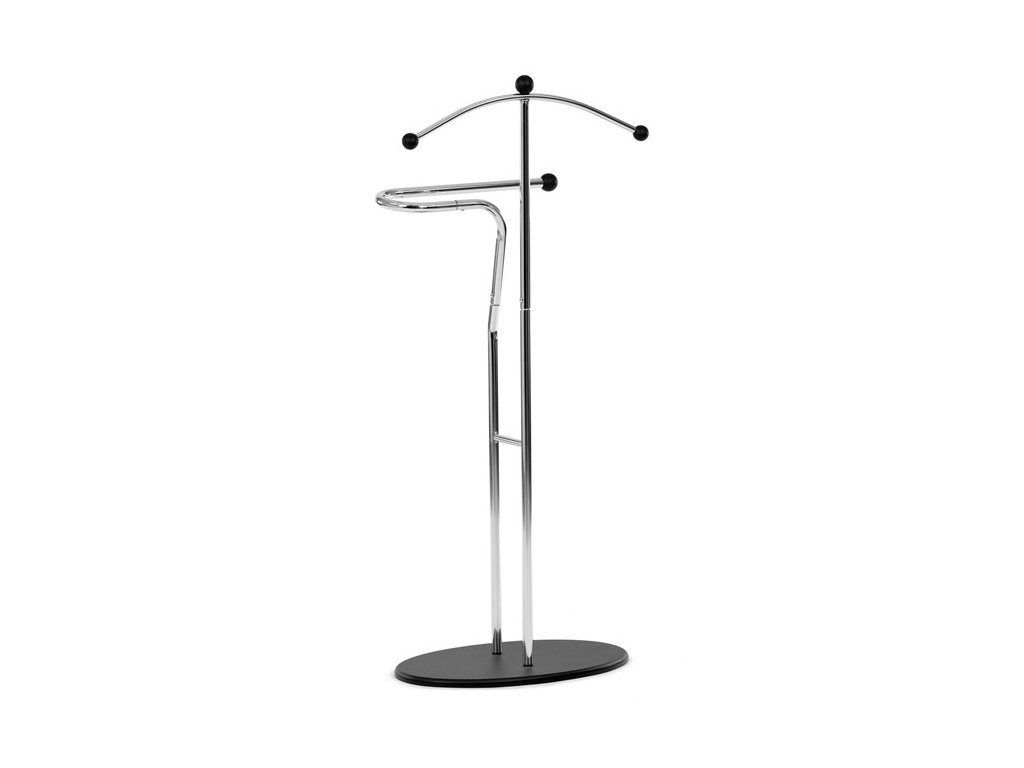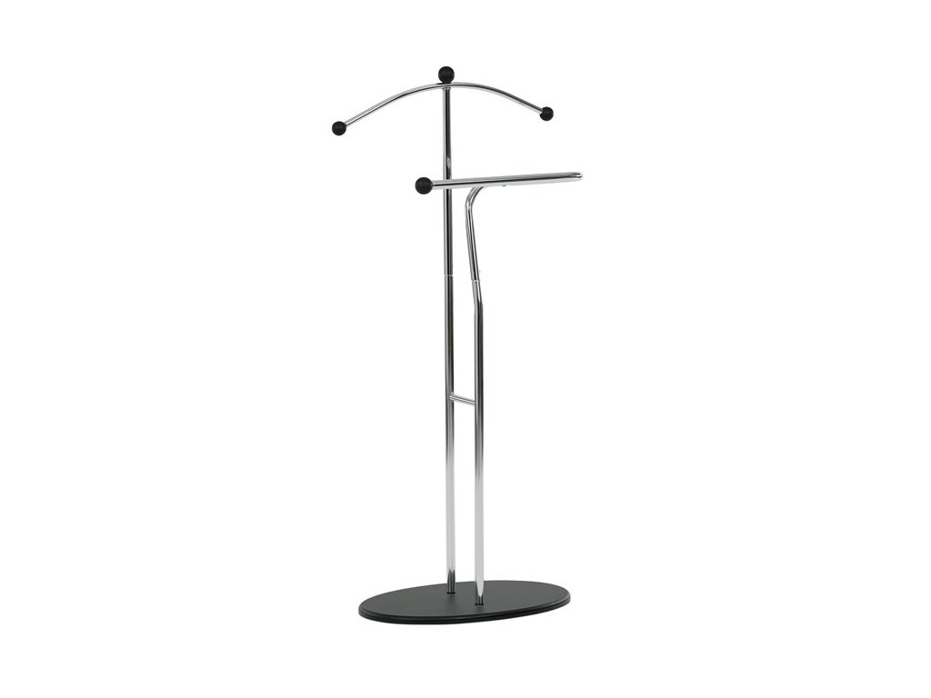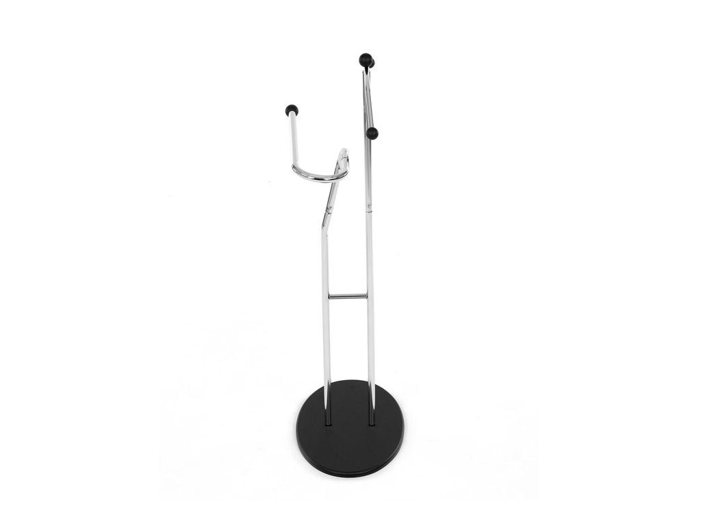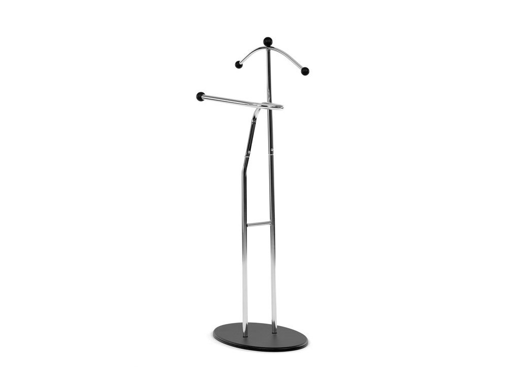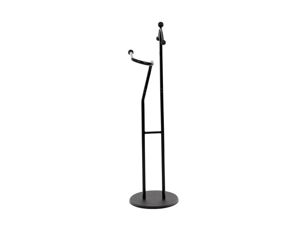 Elegantný nemý sluha v minimalistickom prevedení je ideálnym doplnkom do spálne alebo šatne. Kovová konštrukcia v čiernom prevedení zabezpečuje pevnosť, odolnosť a dlhú životnosť, pričom štíhly dizajn pôsobí moderne a nadčasovo.Ramienko na zavesenie saka alebo košele dopĺňa praktický držiak na nohavice či kravaty. Vďaka stabilnej oválnej základni stojí pevne na mieste a nezaberá veľa priestoru, takže sa hodí aj do menších interiérov. Kombinácia funkčnosti a štýlového vzhľadu robí z tohto nemého sluhu praktického pomocníka na každodenné používanie.