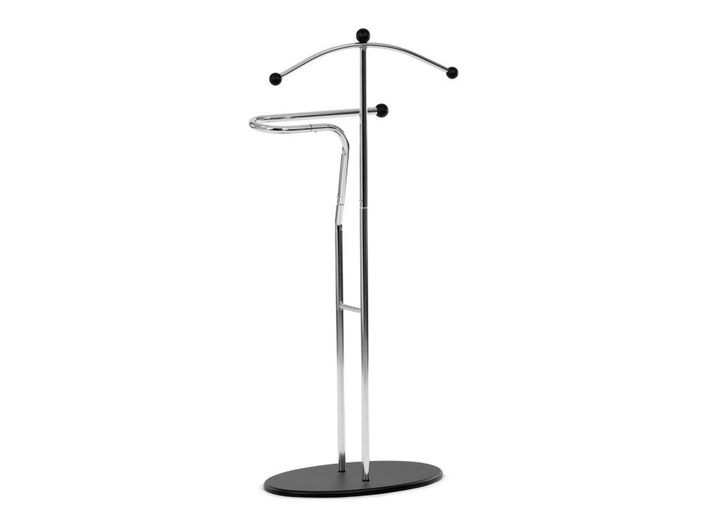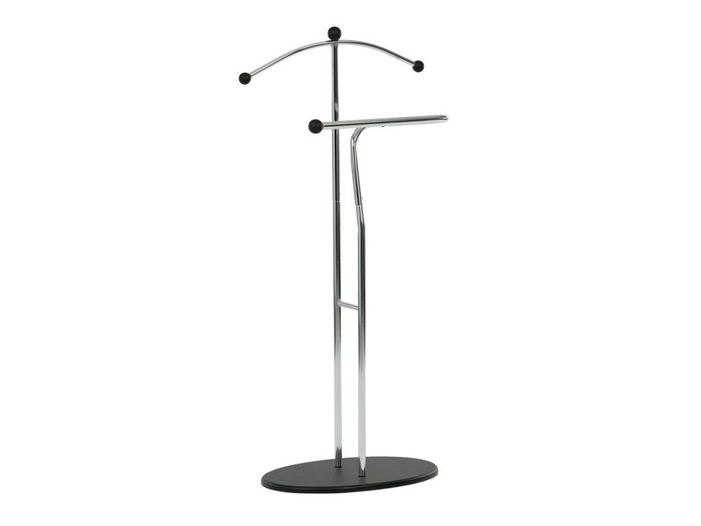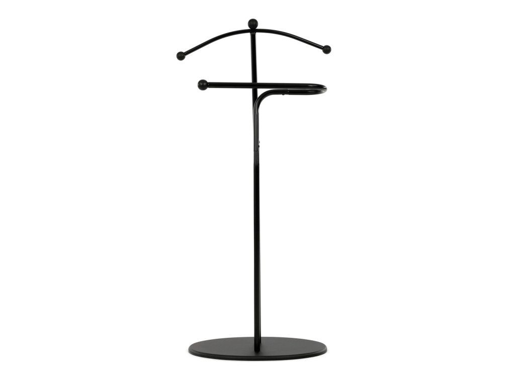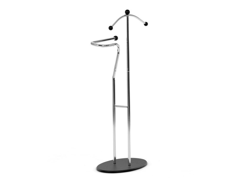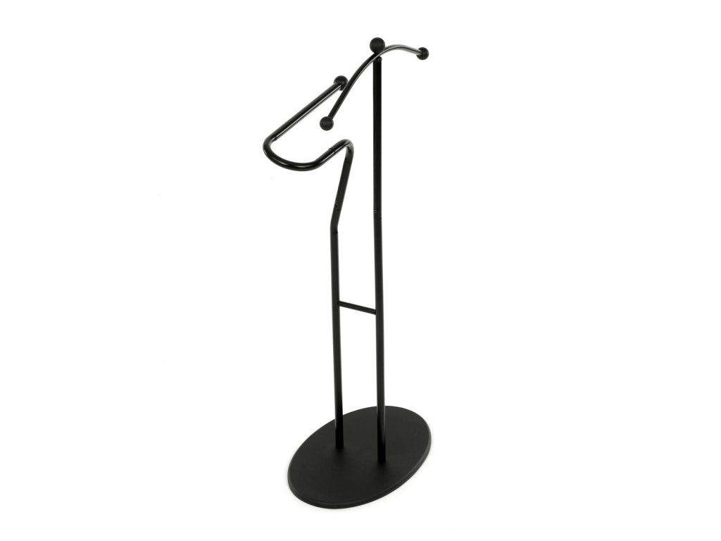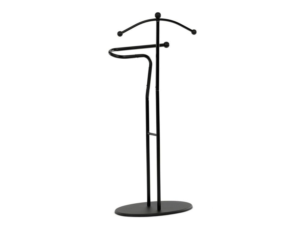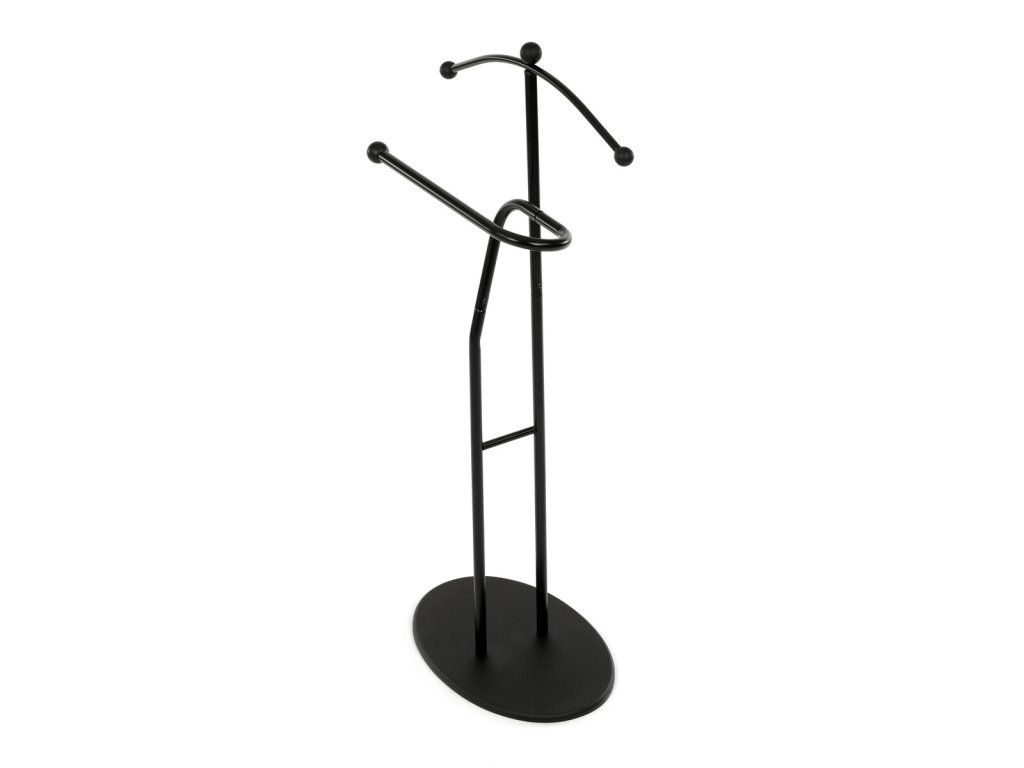 Elegantný nemý sluha v minimalistickom prevedení je ideálnym doplnkom do spálne alebo šatne. Kovová konštrukcia v čiernom prevedení zabezpečuje pevnosť, odolnosť a dlhú životnosť, pričom štíhly dizajn pôsobí moderne a nadčasovo.Ramienko na zavesenie saka alebo košele dopĺňa praktický držiak na nohavice či kravaty. Vďaka stabilnej oválnej základni stojí pevne na mieste a nezaberá veľa priestoru, takže sa hodí aj do menších interiérov. Kombinácia funkčnosti a štýlového vzhľadu robí z tohto nemého sluhu praktického pomocníka na každodenné používanie.