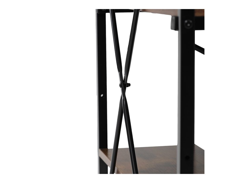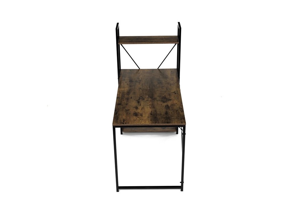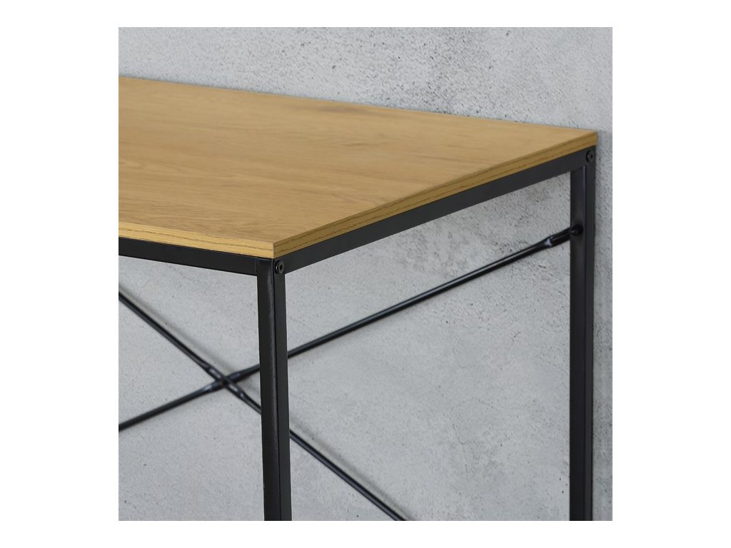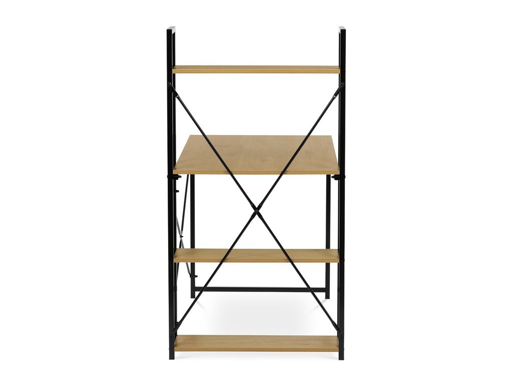 Písací stôl s pripojeným regálom. Kostra stola je kovová v povrchovej úprave čierneho laku. Doska stola a police sú z odolnej MDF potiahnutej 3D fóliou vo farbe dub. Pre väčšiu stabilitu sú zadné časti stola vystužené kovovými vzperami efektne skríženými v tvare písmena X.Dodatočné parametre