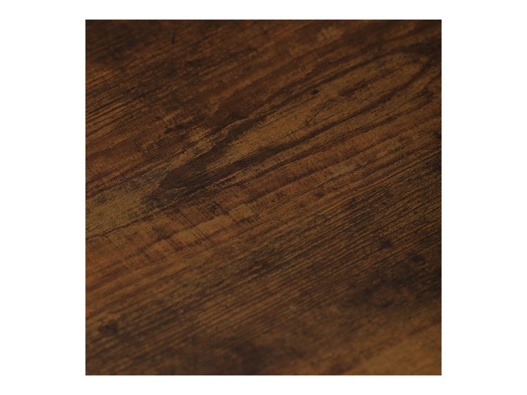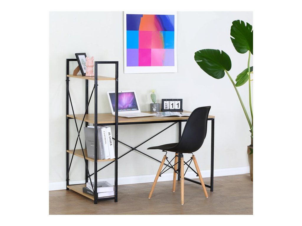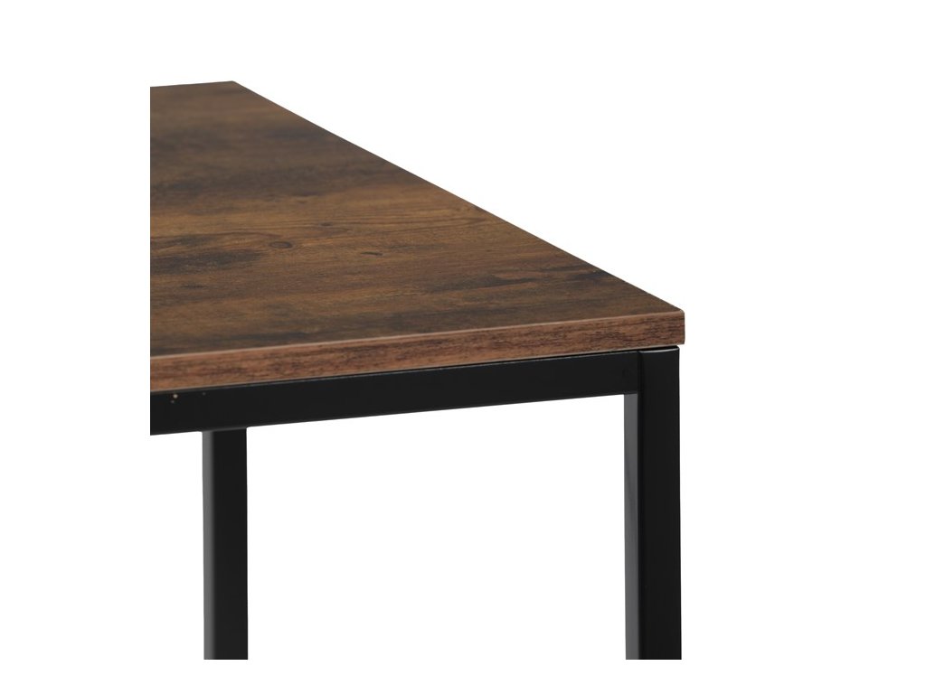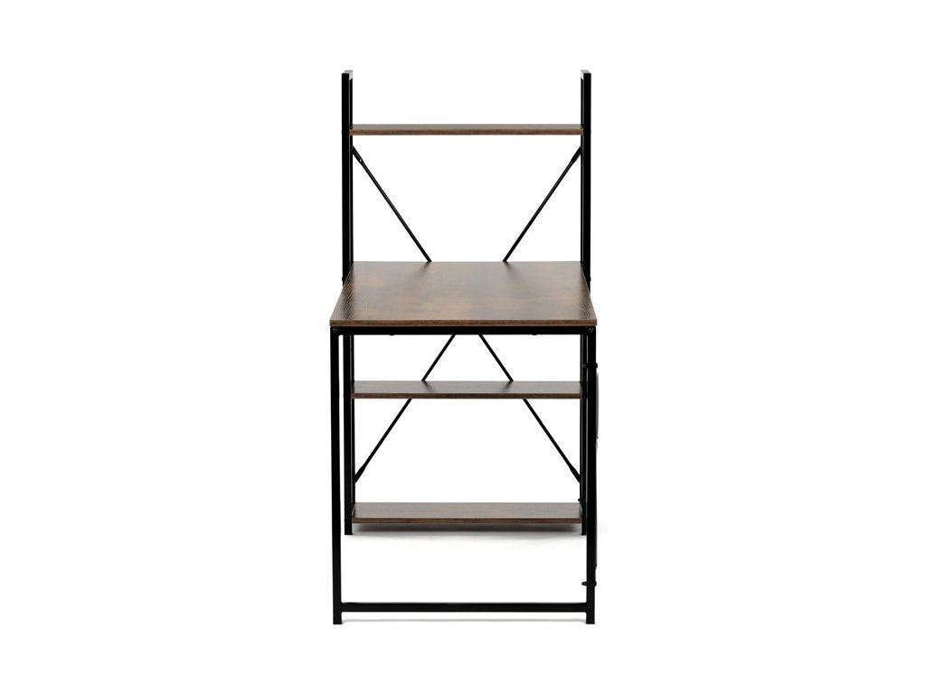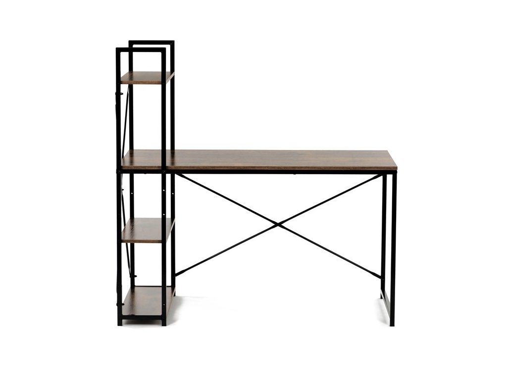 Písací stôl s pripojeným regálom. Kostra stola je kovová v povrchovej úprave čierneho laku. Doska stola a police sú z odolnej MDF potiahnutej 3D fóliou vo farbe dub. Pre väčšiu stabilitu sú zadné časti stola vystužené kovovými vzperami efektne skríženými v tvare písmena X.Dodatočné parametre