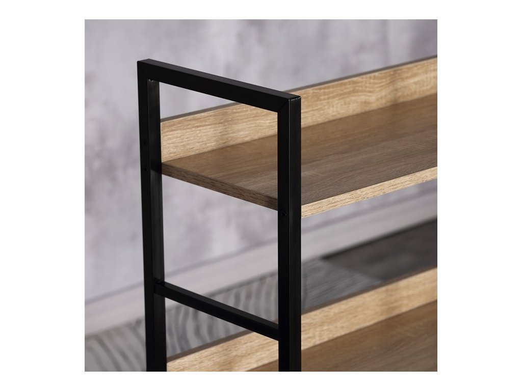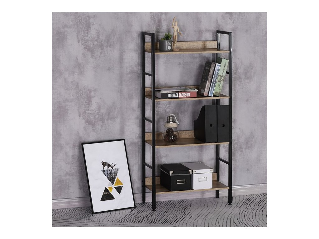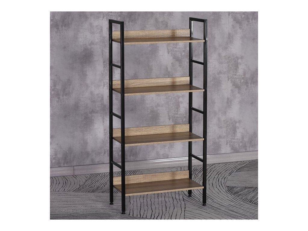 Praktický a štýlový regál so 4 policami. Kostra je vyrobená z kovového profilu v elegantnom čiernom nástreku, police sú z MDF dosky s povrchovou úpravou v dizajne 3D DUB s praktickým zadným čielkom.Dodatočné parametre