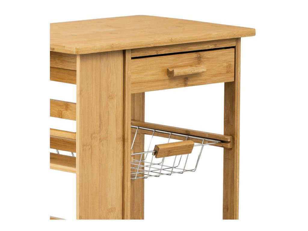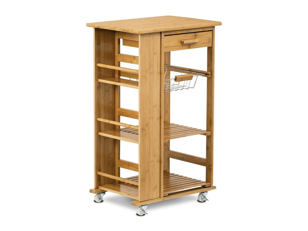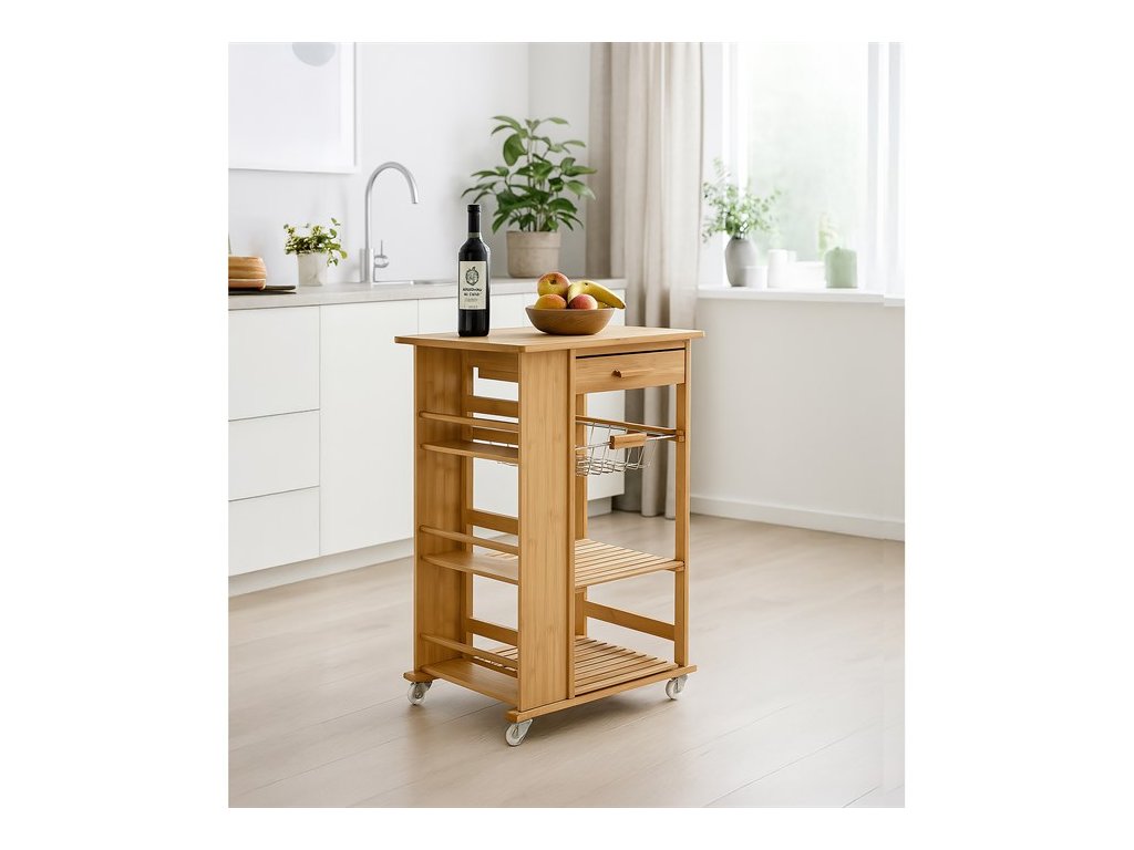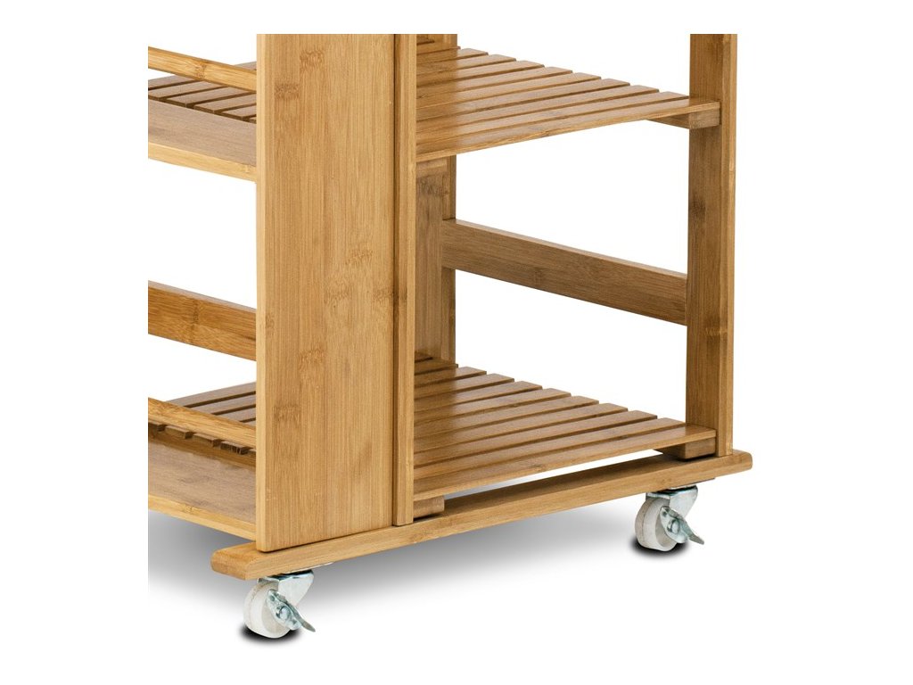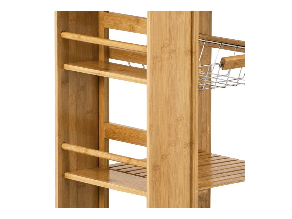 Servírovací stolík a regál z masívneho bambusu v prírodnom odtieni ponúka praktické riešenie na uskladnenie a prenášanie kuchynských doplnkov či potravín. Robustné bambusové telo je doplnené o niekoľko políc s latkovým prevedením, ktoré zabezpečujú dostatočnú ventiláciu a prehľadnosť uložených predmetov. Súčasťou je aj zásuvka s bambusovou úchytkou pre menšie drobnosti a kovový košík s bambusovou rukoväťou, ideálny na ovocie alebo zeleninu. Pojazdové kolieska umožňujú jednoduchú manipuláciu a presun stolíka podľa potreby. Celkový dizajn spája prírodný materiál s funkčnosťou, čo ocení každý, kto hľadá stabilné a variabilné riešenie do kuchyne či jedálne.