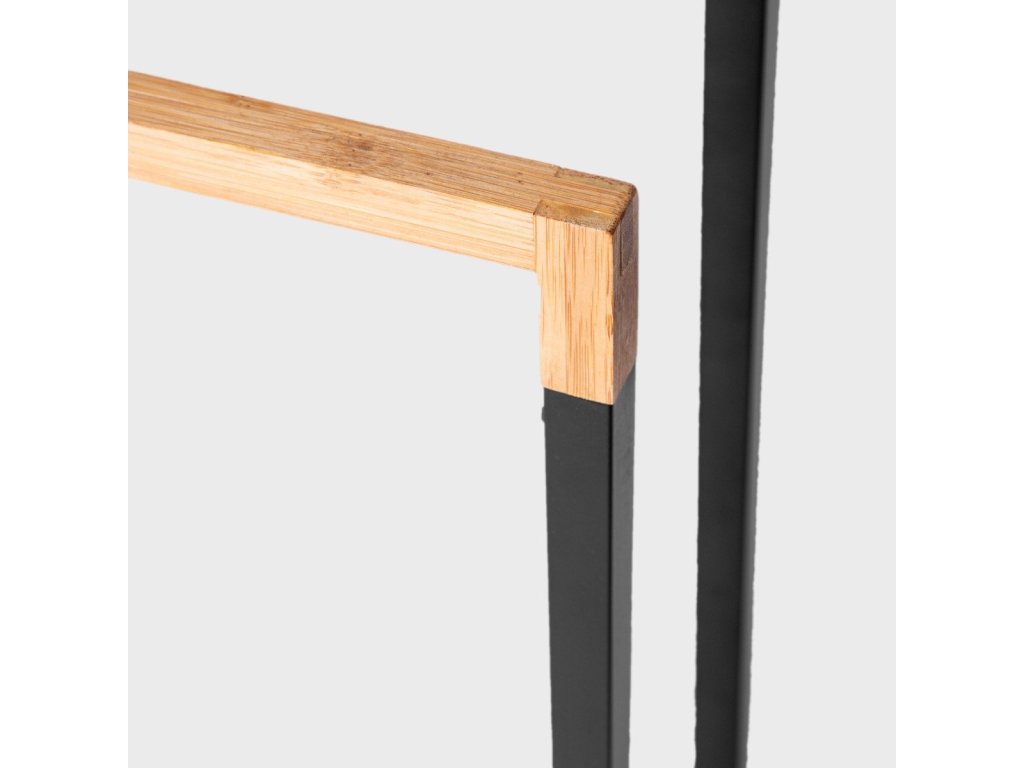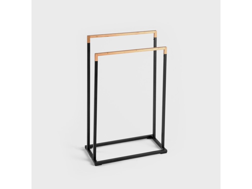 Stojan na uteráky COPER prináša čistý, moderný dizajn, ktorý výborne zapadne do minimalistických aj prírodne ladených kúpeľní. Kombinácia čiernej kovovej konštrukcie a svetlého dreveného prvku pôsobí veľmi elegantne, harmonicky a nadčasovo. Vďaka dvom samostatným priečkam poskytuje dostatok priestoru na zavesenie a vysušenie viacerých uterákov naraz – rýchlo a vzdušne.Nie je potrebné žiadne vŕtanie ani montáž na stenu, stojan jednoducho postavíte tam, kde ho práve potrebujete. Stabilná kovová základňa zabezpečuje pevnosť a dlhú životnosť.