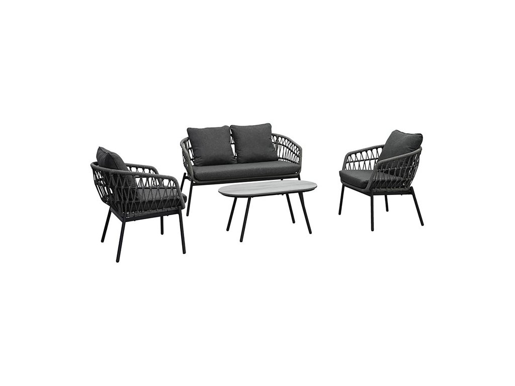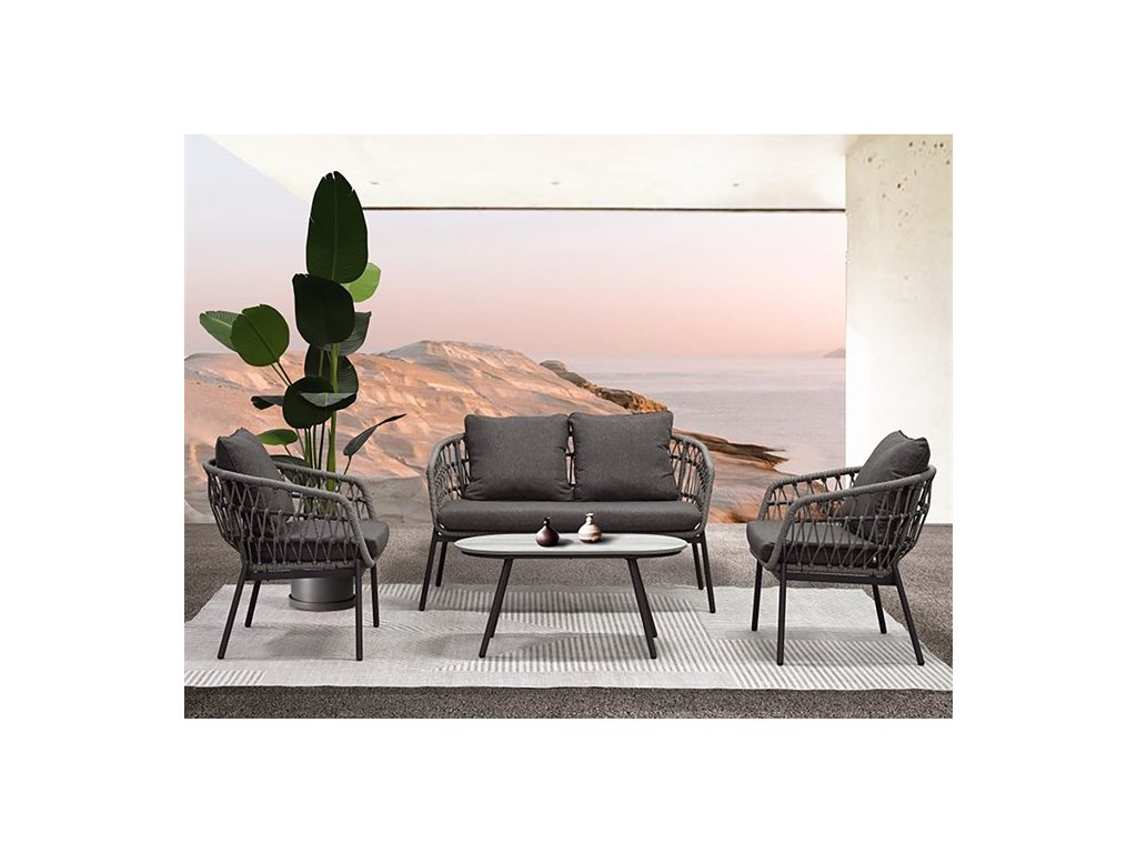 Táto elegantná záhradná sedacia súprava je perfektnou voľbou pre každú vonkajšiu terasu či záhradu. Je vyrobená z odolného polyratanu v sivom odtieni, ktorý dodáva nábytku elegantný a moderný vzhľad. Konštrukcia z kovu s práškovou úpravou v antracitovej farbe zaručuje dlhú životnosť a odolnosť. Vodeodolné vankúše poskytujú maximálne pohodlie a sú ideálne na vonkajšie použitie za každého počasia. Doska stolíka je vyrobená z polywood materiálu, ktorý má veľmi dlhú životnosť a je odolný proti vonkajším vplyvom počasia. Tento set kombinuje štýl a funkčnosť, či už chcete relaxovať alebo usporiadať vonkajšie posedenie s priateľmi. Súprava je navyše ľahko udržiavateľná a veľmi praktická.Dodatočné parametre