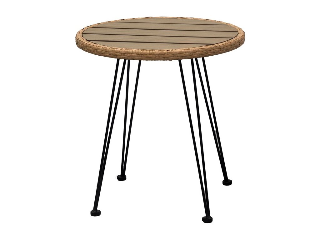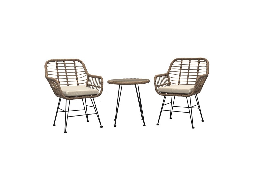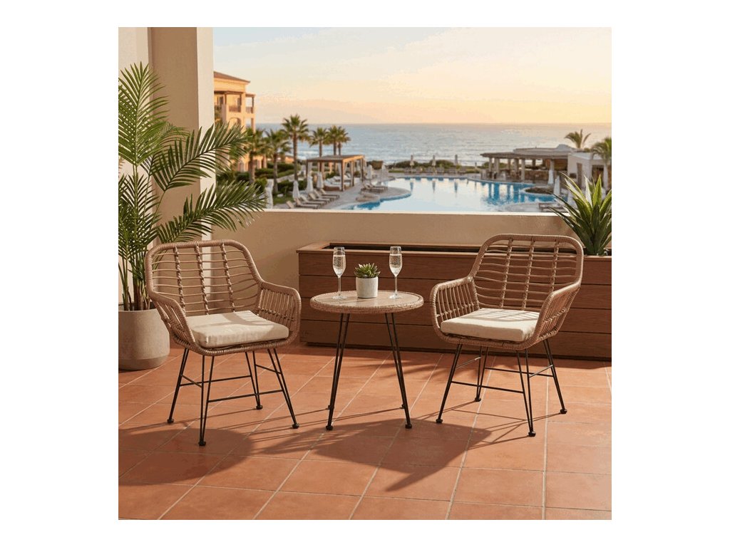 Elegantný záhradný set 2+1 je ideálnou voľbou pre moderné vonkajšie posedenie. Tento set v prírodnom prevedení obsahuje dve štýlové kresielka a okrúhly stolík s doskou z polywoodu, ktorý odoláva nepriaznivým vonkajším podmienkam. Konštrukcia je z pevného ale ľahkého kovu, zatiaľ čo sedacia časť je vyrobená z kvalitného polyratanu, ktorý spája pohodlie, dizajn a odolnosť. Set pôsobí vzdušne a vďaka minimalistickému designu ľahko zapadne do akéhokoľvek vonkajšieho prostredia. Nohy majú trvácu povrchovú úpravu v elegantnom čiernom prevedení, na koncoch sú použité okrúhle krytky, ktoré chránia podlahu pred poškriabaním a zvyšujú komfort sedenia. Skvele sa hodí na terasu či balkón, kde poskytne pohodlný priestor na relaxáciu. 5 cm hrubé béžové sedáky z vodeodolného polyesteru sú súčasťou balenia.