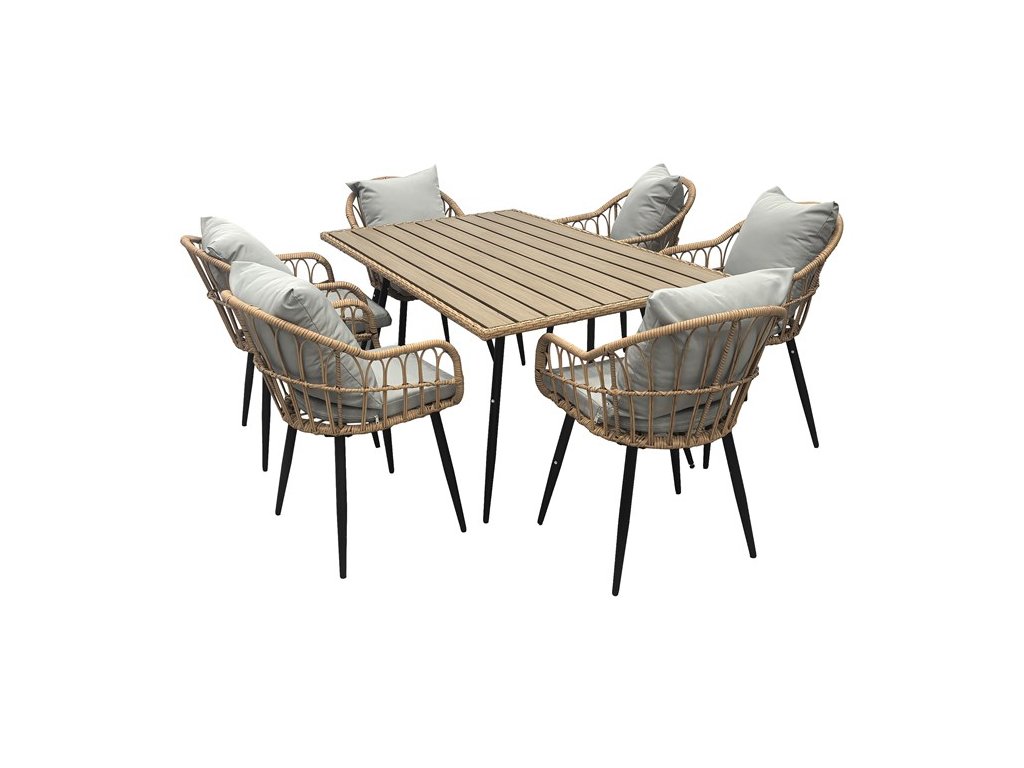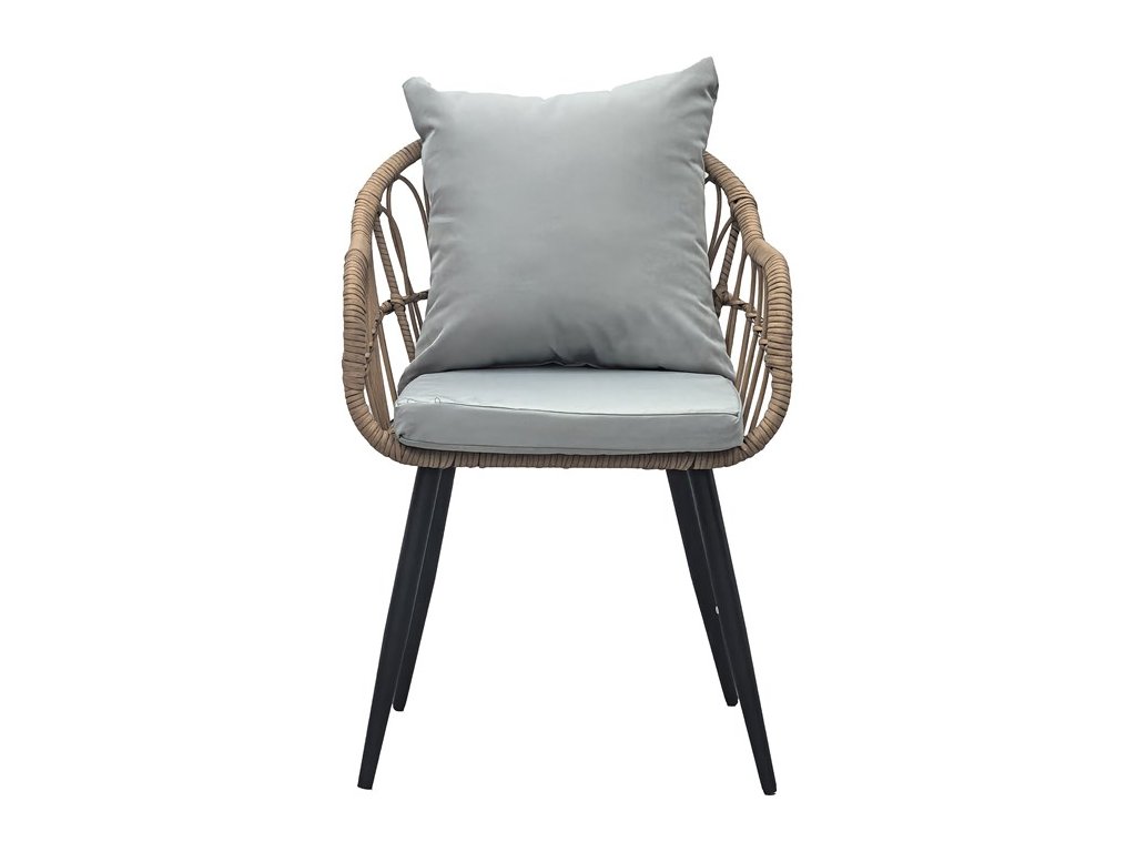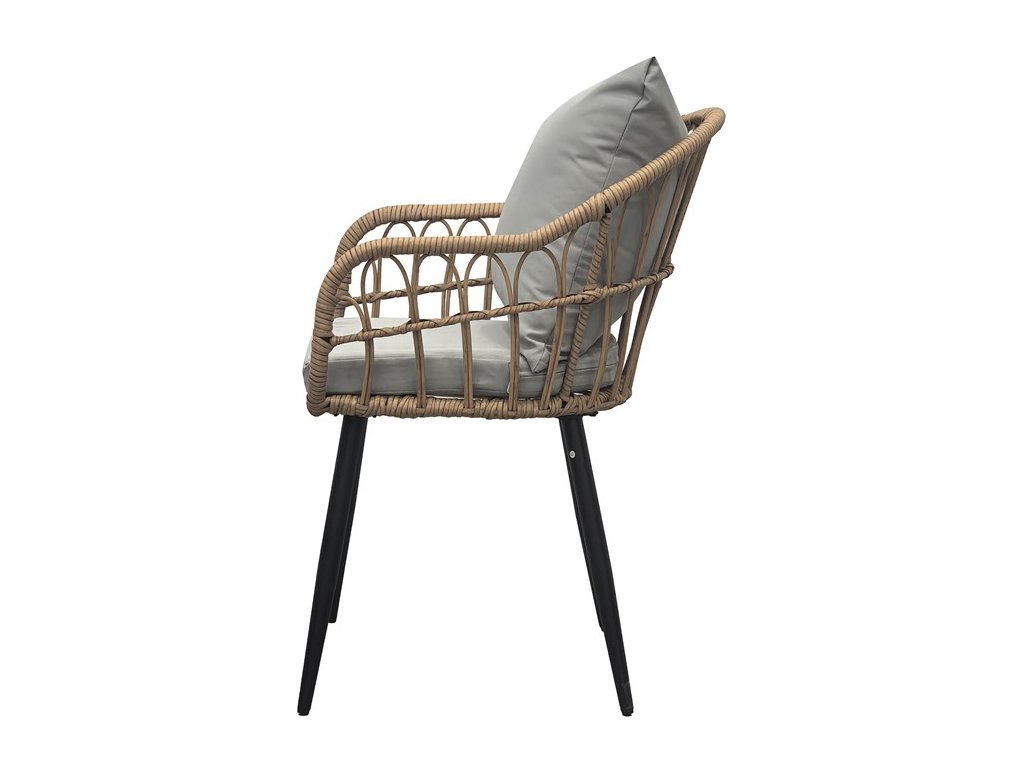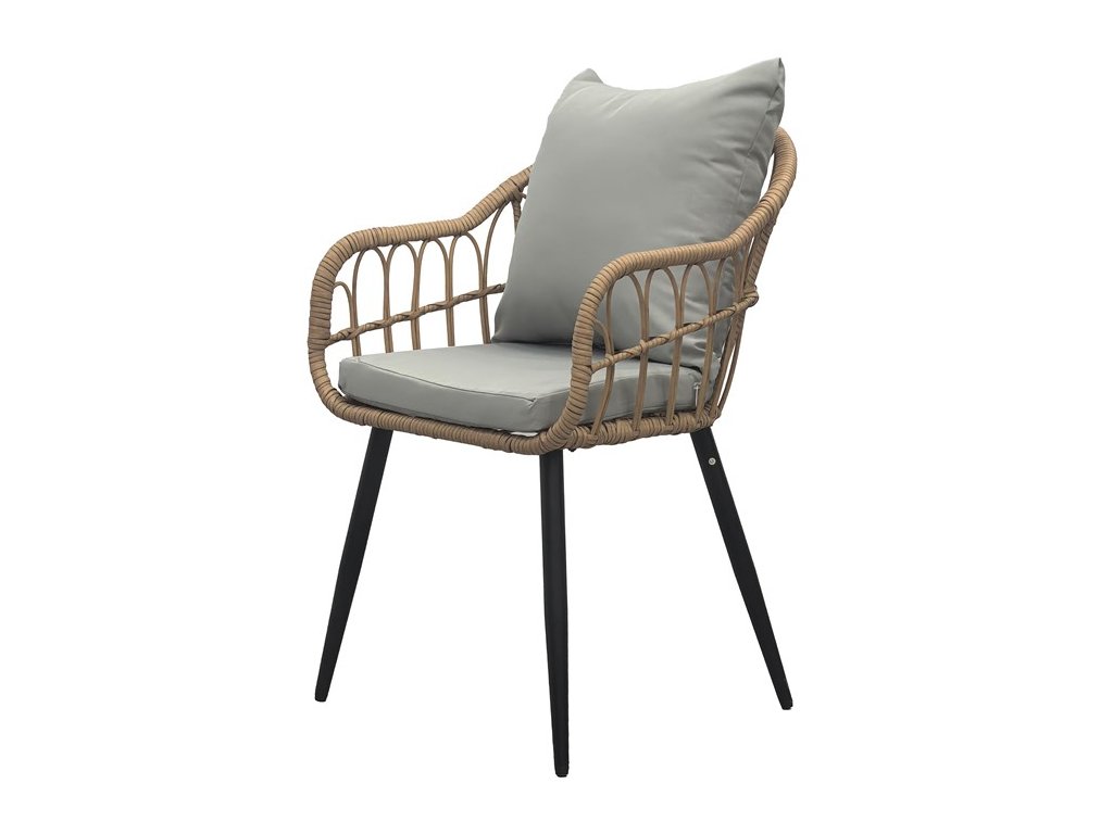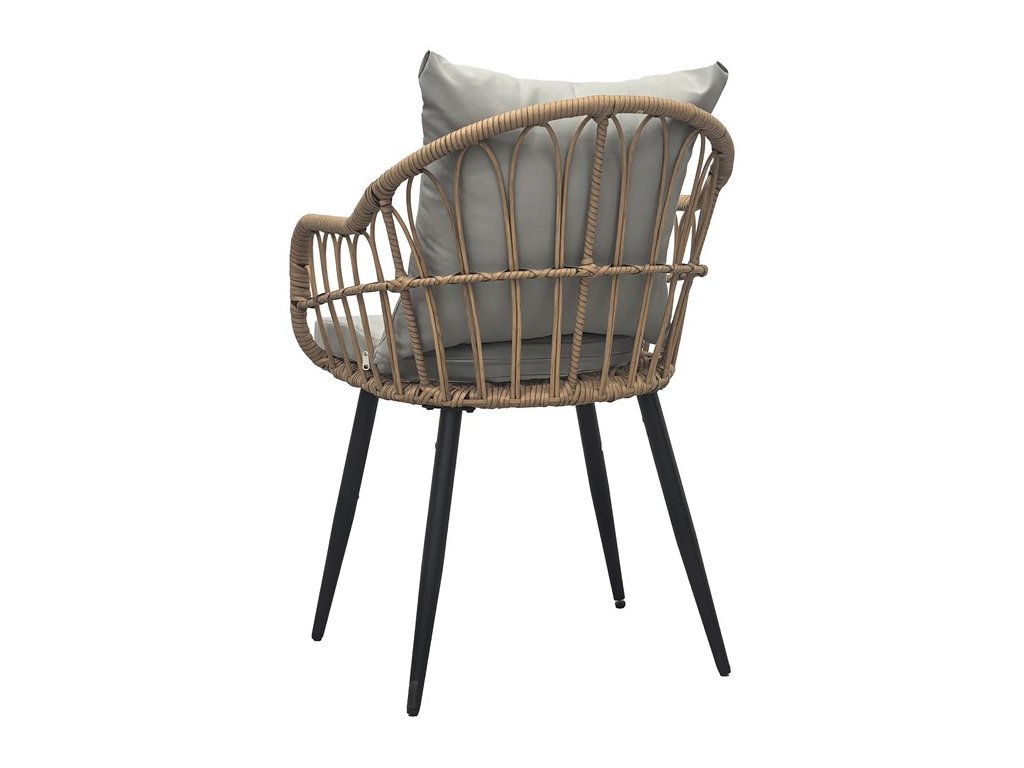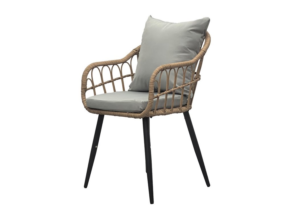 Moderné záhradné kreslo, ktoré spája štýlový dizajn a funkčnosť. Je vyrobené z kvalitného polyratanu v prírodnej farbe, ktorý zaisťuje odolnosť voči vonkajším podmienkam a zároveň pridáva kreslu príjemný prírodný vzhľad. Pevná kovová konštrukcia dodáva stabilitu a pevnosť, spolu s moderným vzhľadom sa kreslo stáva skvelým funkčným doplnkom na terasu, záhradu alebo balkón. Vďaka ergonomickému tvaru poskytuje pohodlné sedenie, ktoré je umocnené čalúneným sedákom a opierkovým vankúšom v príjemnej a zároveň odolnej látke.