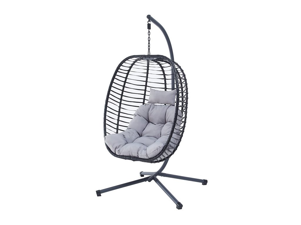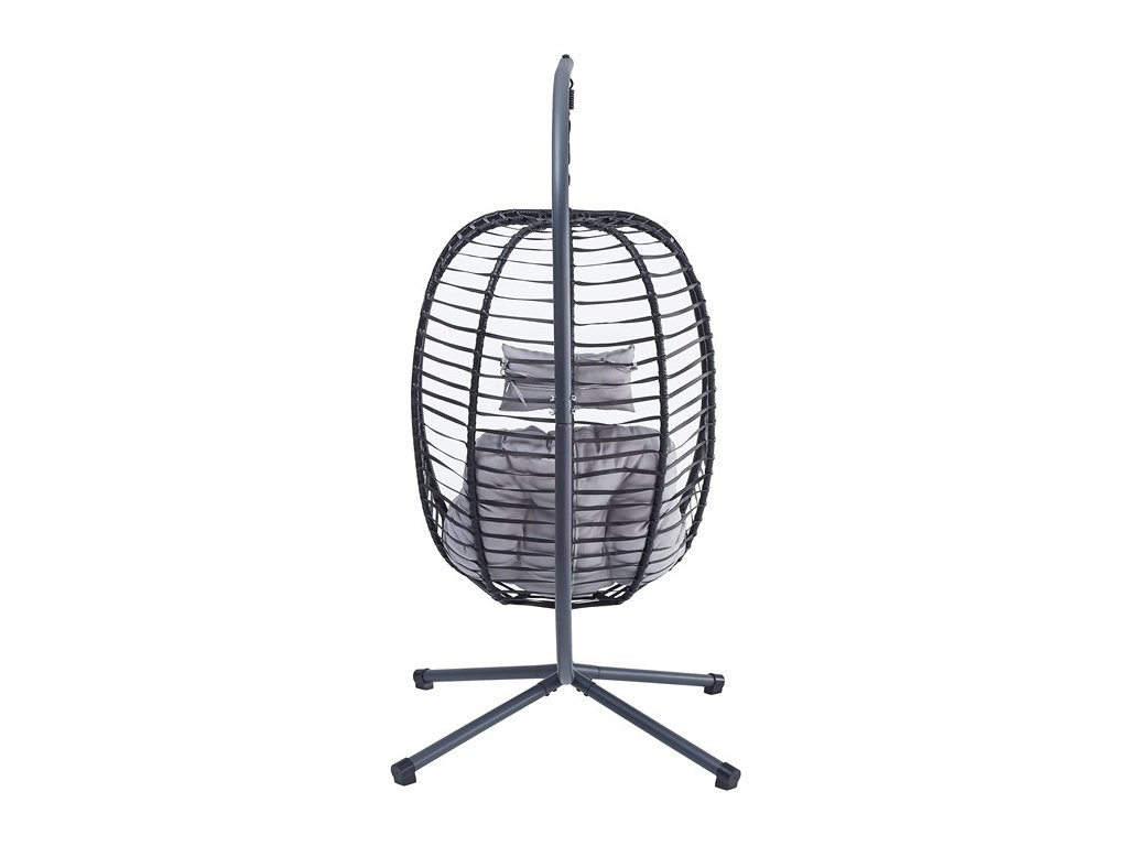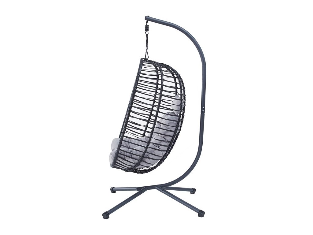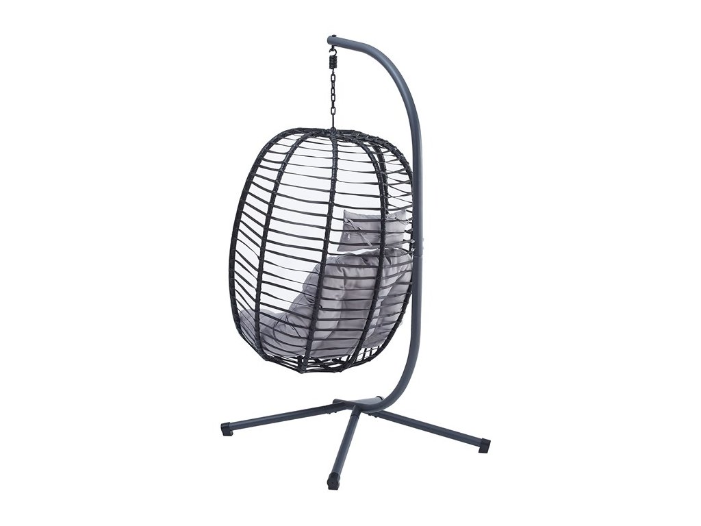 Dizajnové závesné kreslo, ktoré prináša pohodlie do vašej záhrady alebo terasy. Kombinácia kovového rámu a elegantného polyratanového výpletu odolného voči vplyvom počasia. Antracitový dizajn s elegantným sivým látkovým čalúnením poskytuje maximálnu relaxáciu a komfort. Centrálne podnož zabezpečuje výbornú stabilitu kresla, zatiaľ čo závesné prevedenie ponúka príjemný hojdavý pohyb. Kreslo je skvelým doplnkom pre chvíle odpočinku v pokojnom vonkajšom prostredí, svoje miesto si nájde v modernom exteriéry ale aj klasickej záhrade.Dodatočné parametre